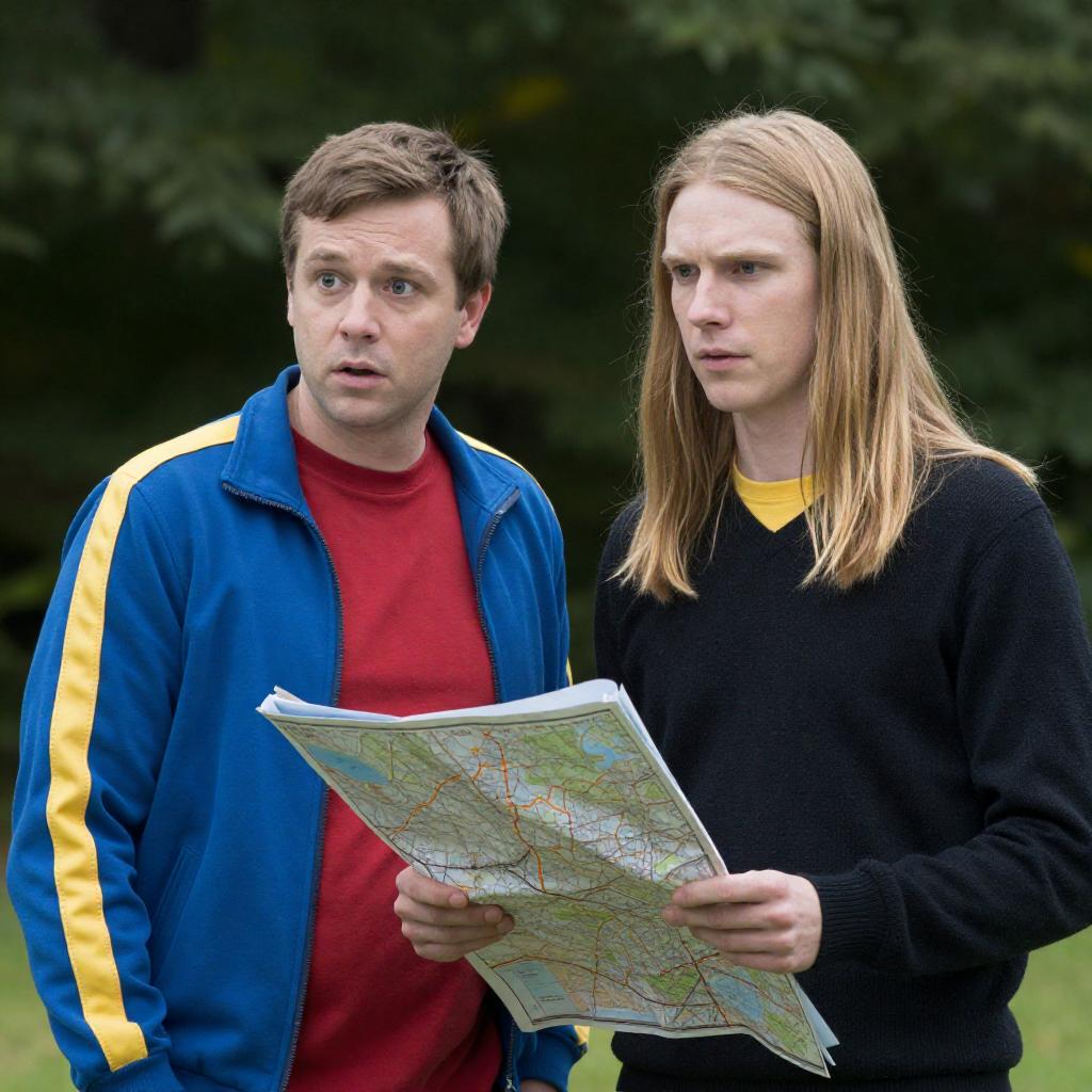 Photograph of two men standing outdoors. The man on the left has short brown hair, wears a blue jacket with yellow stripes, and white pants, laughing with his hand near his mouth. The man on the right has blonde hair, wears a black sweater with a yellow collar and blue pants, and is scratching his head with a confused expression. They are surrounded by green bushes and trees.
