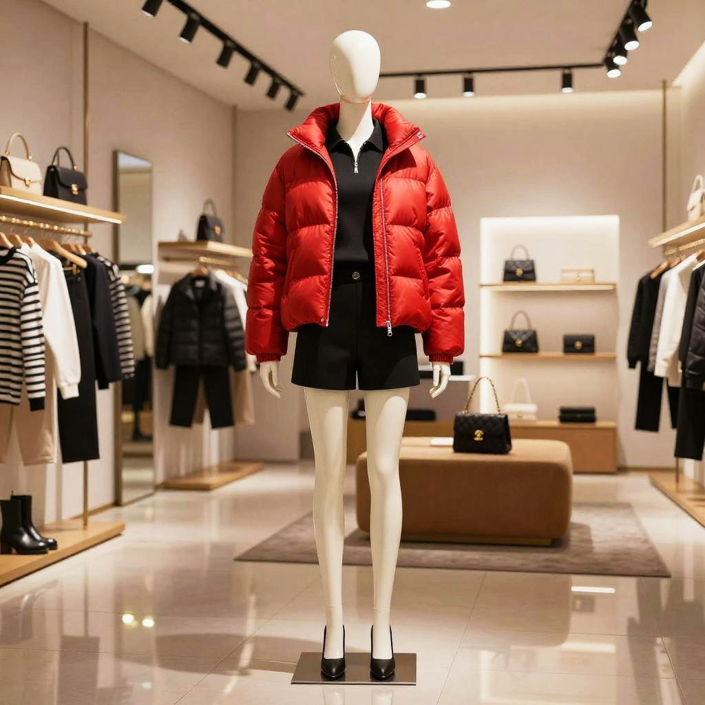 Short red puffer jacket displayed on a sleek mannequin in a trendy boutique, surrounded by fashion accessories and ambient warm lighting, reflections on polished floor, contemporary retail design vibe, ultra-realistic rendering