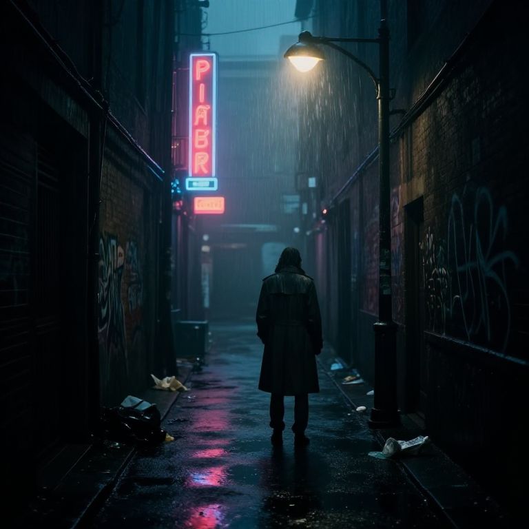 Dark and eerie urban alley drenched in rain, flickering neon signs barely piercing the fog, scattered trash and graffiti-covered walls, a lone figure in a trench coat standing under a dim streetlamp, noir-inspired moody scene with suspense and tension.
