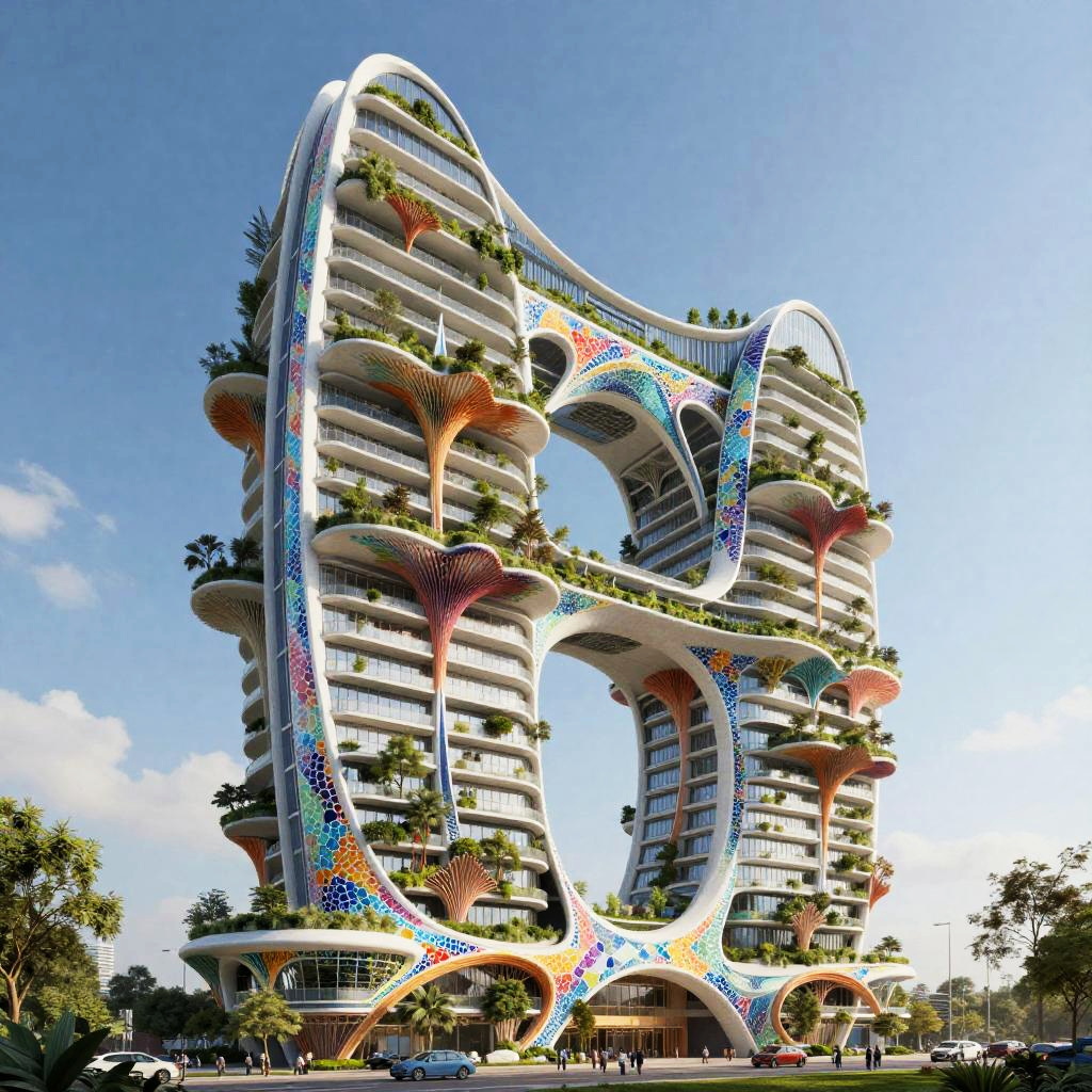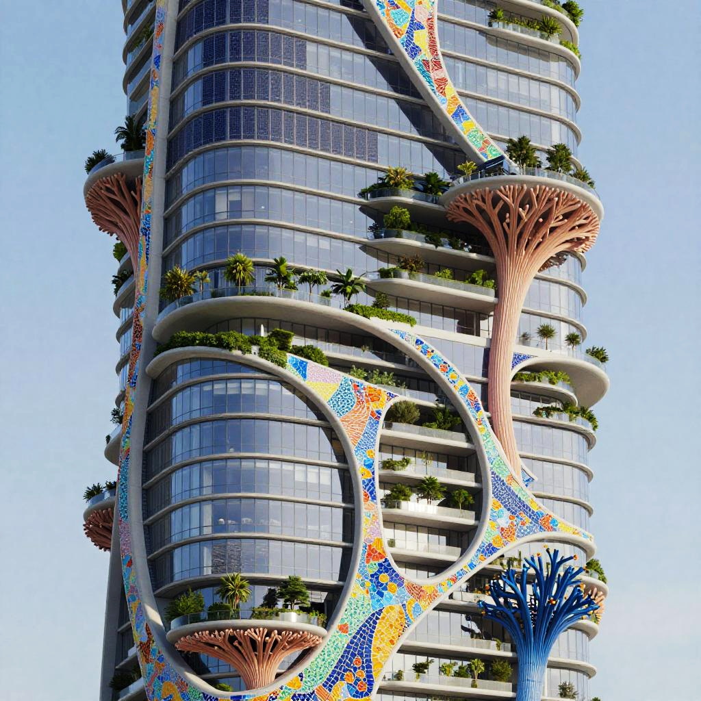 Visionary eco-friendly skyscraper in the style of Bjarke Ingels, with folded and stacked crystalline volumes, a facade covered in colorful mosaic panels, integrated vertical gardens, sculptural balconies inspired by tree branches, flowing forms resembling coral reefs, ultra-modern yet surreal, highly detailed, professional rendering, vibrant and imaginative design, sustainable materials, high quality