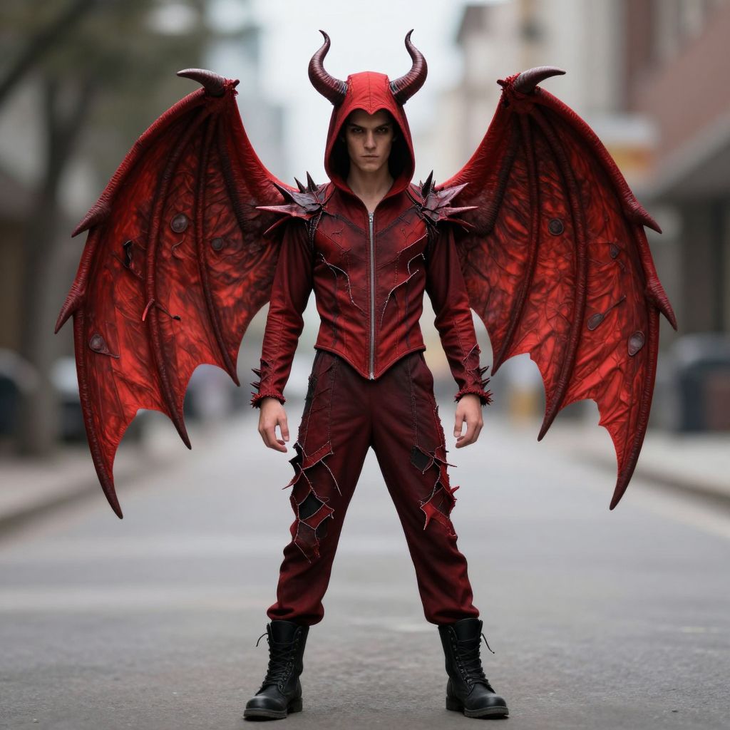 Photograph of a young man standing confidently on an urban street. He wears a red, hooded, form-fitting jacket with black, spiked shoulder armor and matching red pants adorned with black, crisscrossing laces. His outfit is completed with black combat boots. The most striking feature is his large, red, dragon-like wings extending from his back, with dark, jagged edges and textured membrane. He has a red, horned helmet covering his head. The background is blurred, showing a city street with buildings and trees, creating a contrast between the detailed, fantastical costume and the mundane urban setting.