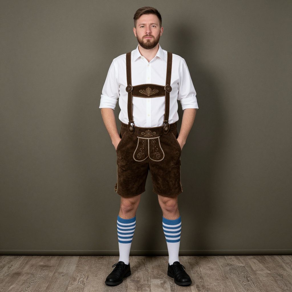 Lederhosen man costume, 1boy, male focus, solo, facial hair, full body, shorts, shirt, beard, suspenders, socks, white shirt, short hair, standing, striped clothes, striped socks, collared shirt, brown shorts, black shorts, hands in pockets, shoes