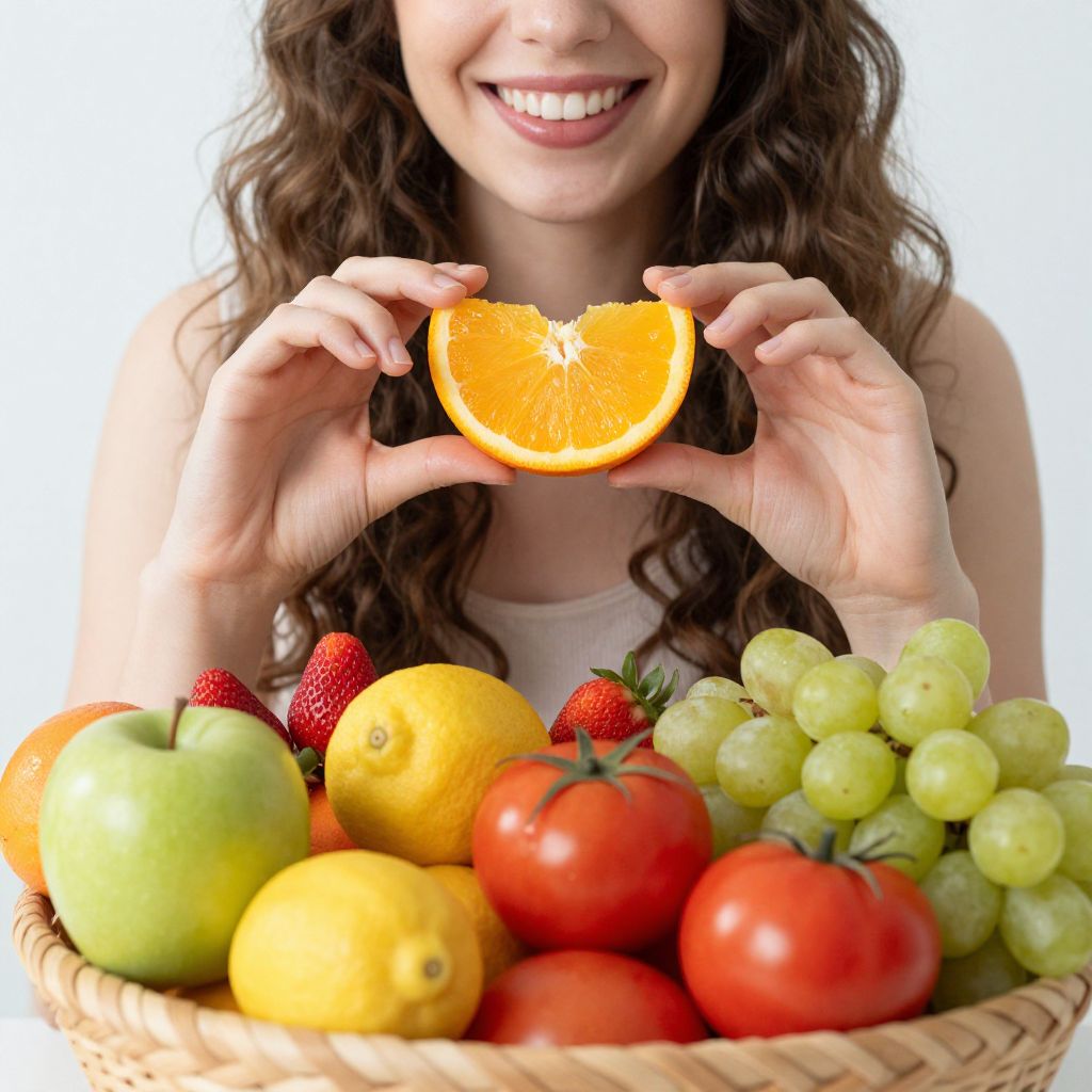 Photograph of a smiling woman with long, wavy brown hair, holding an orange slice above a wicker basket filled with colorful fruits. The basket contains green apples, yellow lemons, red strawberries, ripe red tomatoes, and green grapes. The woman's light skin contrasts with the vivid colors of the fruits. She is wearing a sleeveless top, and the background is a simple, blurry white, keeping focus on the vibrant produce and her cheerful expression. The image is bright and clear, emphasizing freshness and natural beauty.