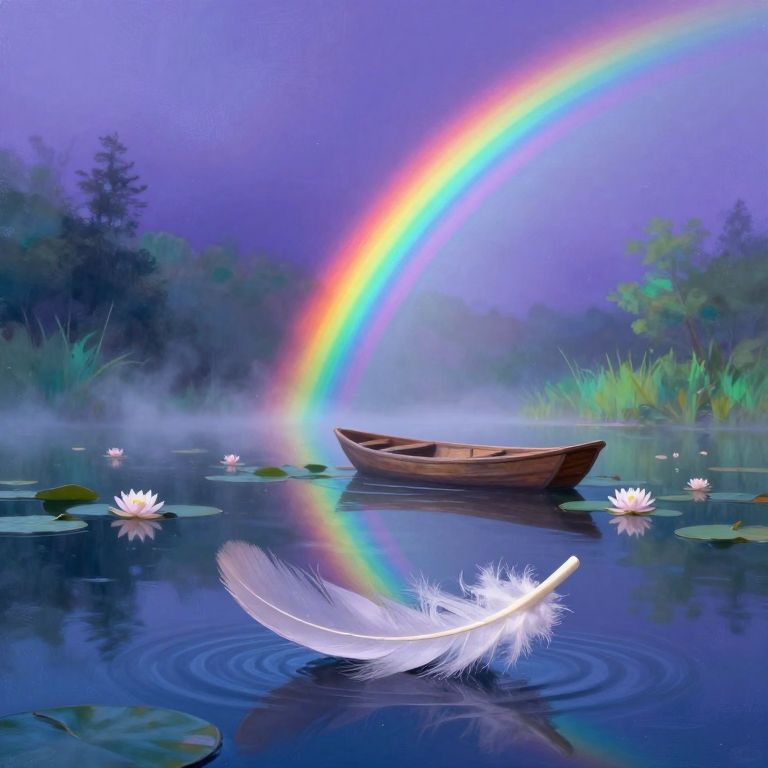 A dreamy landscape bathed in the glow of a vibrant double rainbow arches over a tranquil pond, observed from the unique vantage point of a floating feather. This enigmatic scene artfully fuses impressionistic brushstrokes with digital artistry, creating a realm where soft, blurred edges and an ethereal color palette of deep purples, shimmering blues, and luminous greens coexist harmoniously. Amidst the misty ambiance, a small wooden boat rests among water lilies, its silhouette barely discernible through gentle ripples and the interplay of light, beckoning viewers to delve into their imagination and uncover the enigmatic tale woven within this captivating and evocative tableau.