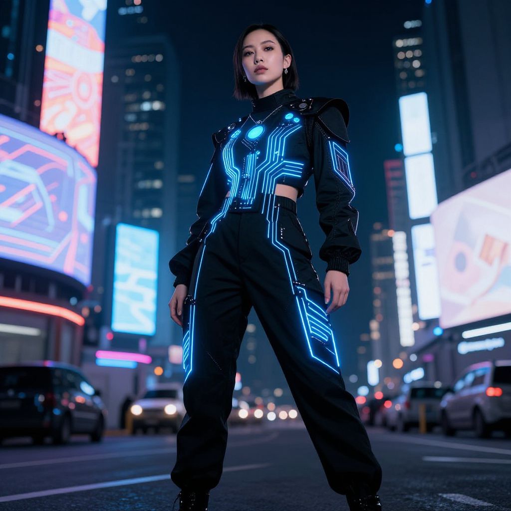 Cyberwear fashion futuristic outfit glowing neon lines and circuits on sleek black fabric, woman standing in urban cyberpunk city at night, vibrant holographic billboards, dramatic lighting, high detail, cinematic atmosphere