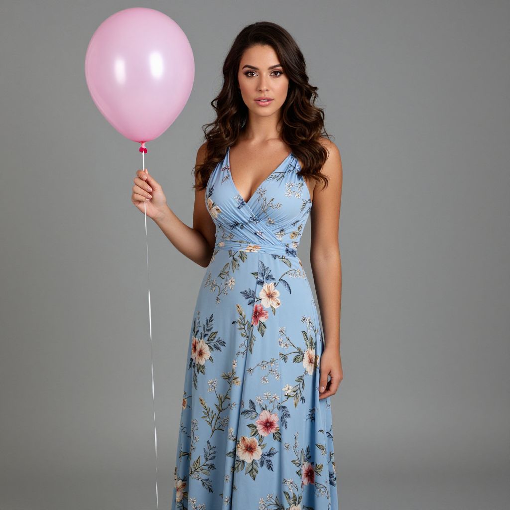 Photograph of a young woman with long, wavy dark brown hair, wearing a sleeveless, light blue, floral-patterned dress with a V-neckline. She holds a pink balloon in her right hand, the balloon's string hanging down. Her dress features white, pink, and blue floral designs. She has a light skin tone and a confident expression. The background is plain gray, making her the focal point. The balloon is slightly to the left of her head, and she stands facing the camera. The overall style is casual yet elegant.