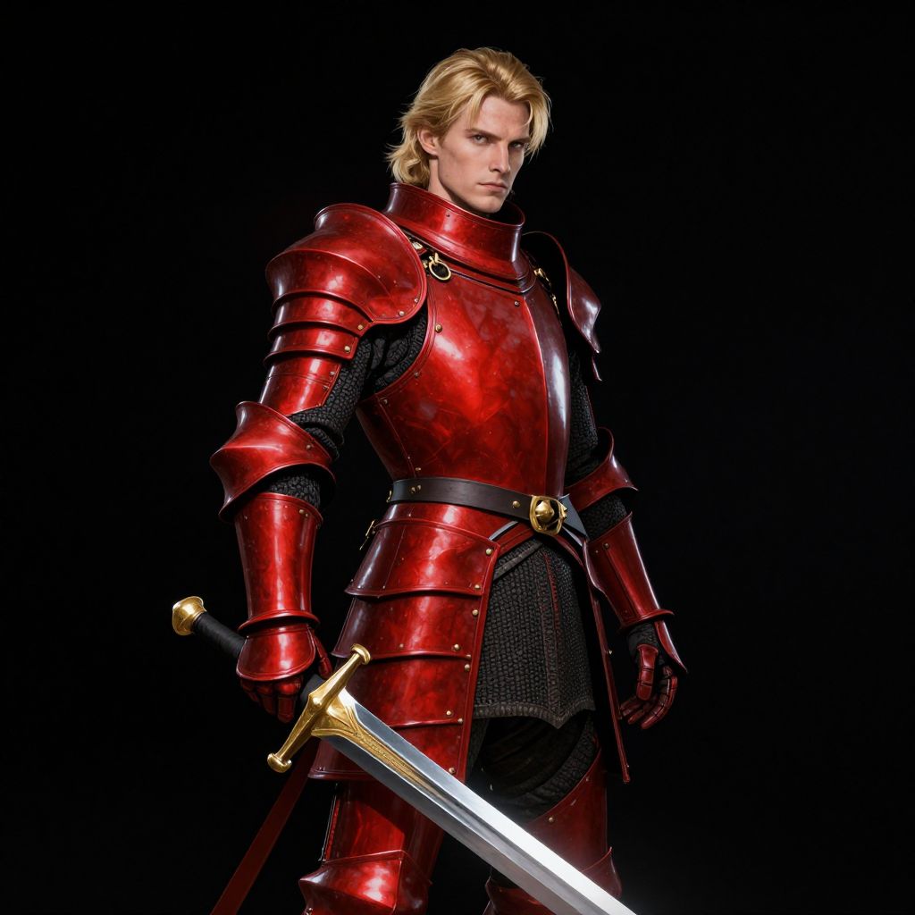 Photorealistic image of a blonde, serious-looking man in shiny red medieval armor, holding a sword, against a black background.