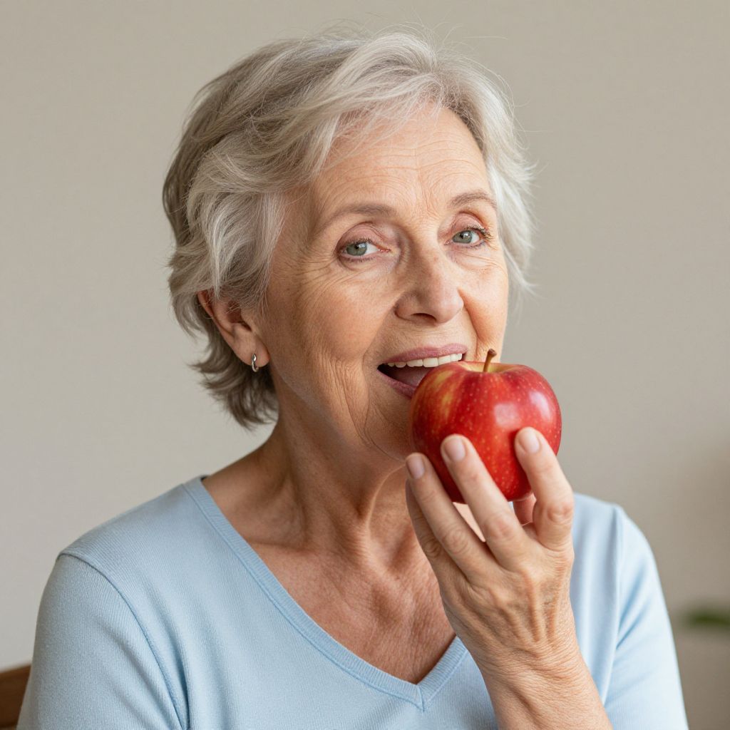 Embracing vitality in every bite, a serene elderly woman cradles a vibrant red apple, symbolizing the enduring connection between nourishment, wisdom, and the timeless pursuit of well-being.