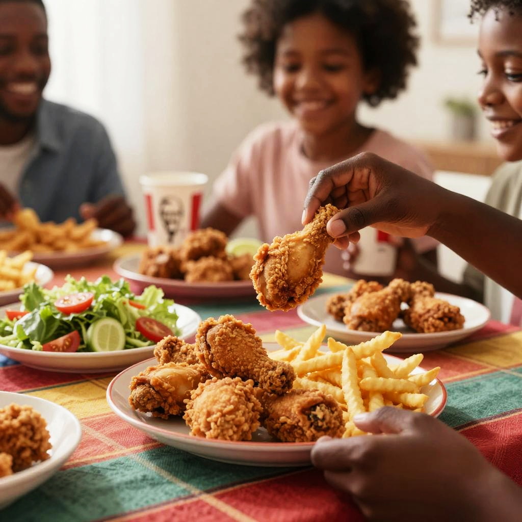 Photograph of a family meal. Three African-American children and one adult, with dark skin and curly hair, sit around a colorful, checkered table. The foreground shows a plate of crispy, golden-brown fried chicken pieces and a side of potato chips. A child's hand, with dark skin, raises a piece of fried chicken to their mouth. In the background, a salad with lettuce and lime slices is visible. Bright natural light illuminates the scene, creating a warm, inviting atmosphere. The children smile, enjoying their meal.