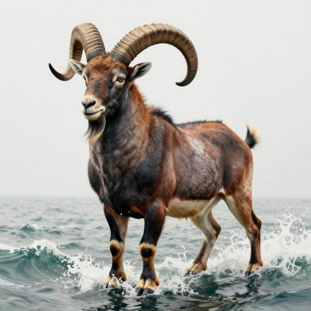 Realistic Capricorn drawing featuring a powerful sea-goat emerging from ocean waves with precise anatomical details, soft lighting highlighting its muscular form, artistic blend of fantasy and natural realism.