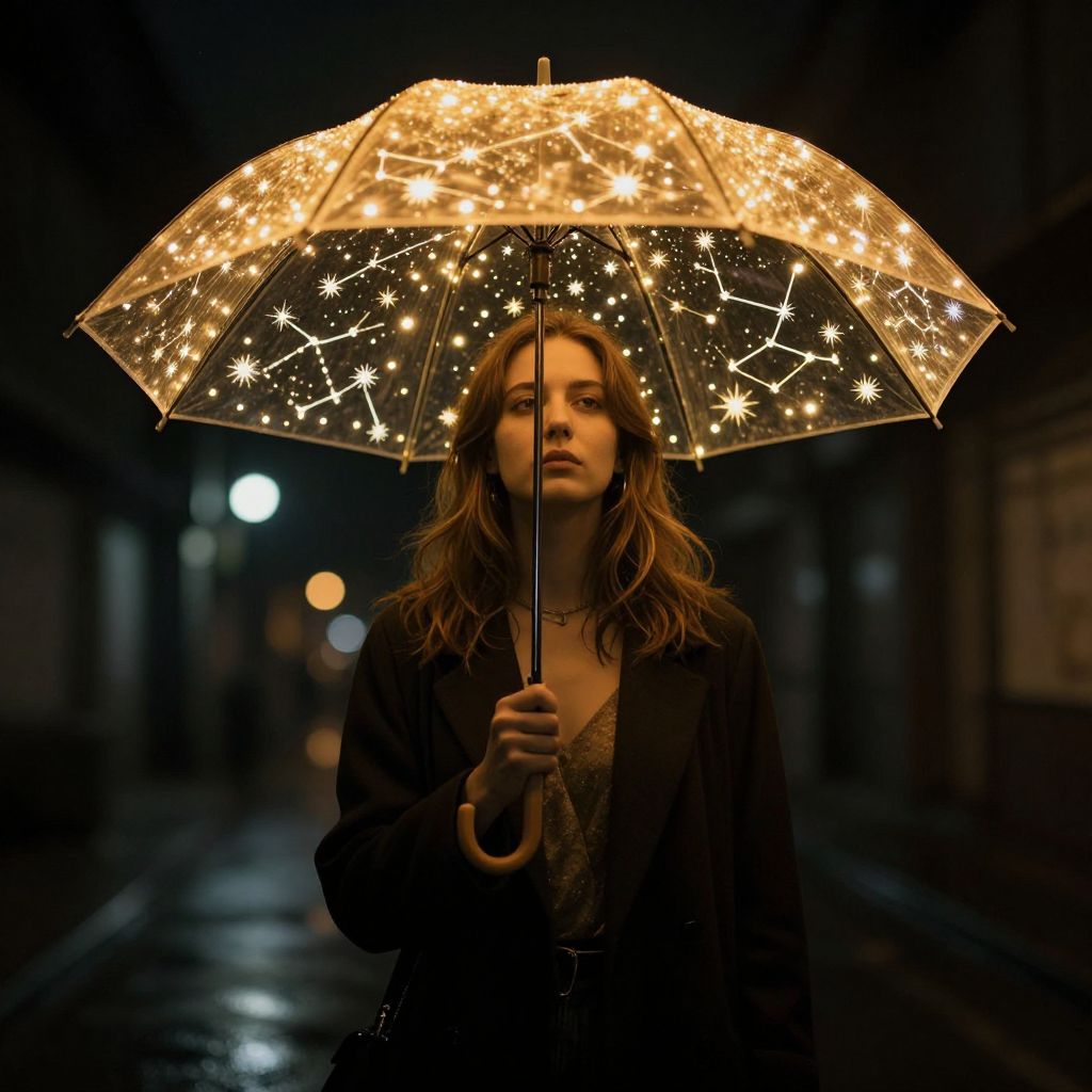 A woman stands under a glowing, starlit umbrella adorned with intricate constellations, illuminated by warm, golden lights that cast a magical, cyberpunk ambiance against the backdrop of a moody, urban night scene.