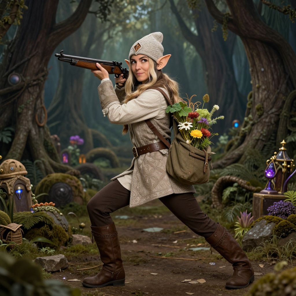 A digitally rendered fantasy image features an elf woman with pointed ears, light skin, and long brown hair, wearing a white beanie, beige tunic, brown belt, black pants, and brown boots. She crouches on a forest path, aiming a black rifle with her right hand. A green satchel with a colorful floral arrangement is slung over her left shoulder. The background is a lush, mystical forest with tall, twisted trees, glowing mushrooms, and magical orbs. The forest floor is covered in moss and scattered with small flowers. The elf's expression is focused and determined.