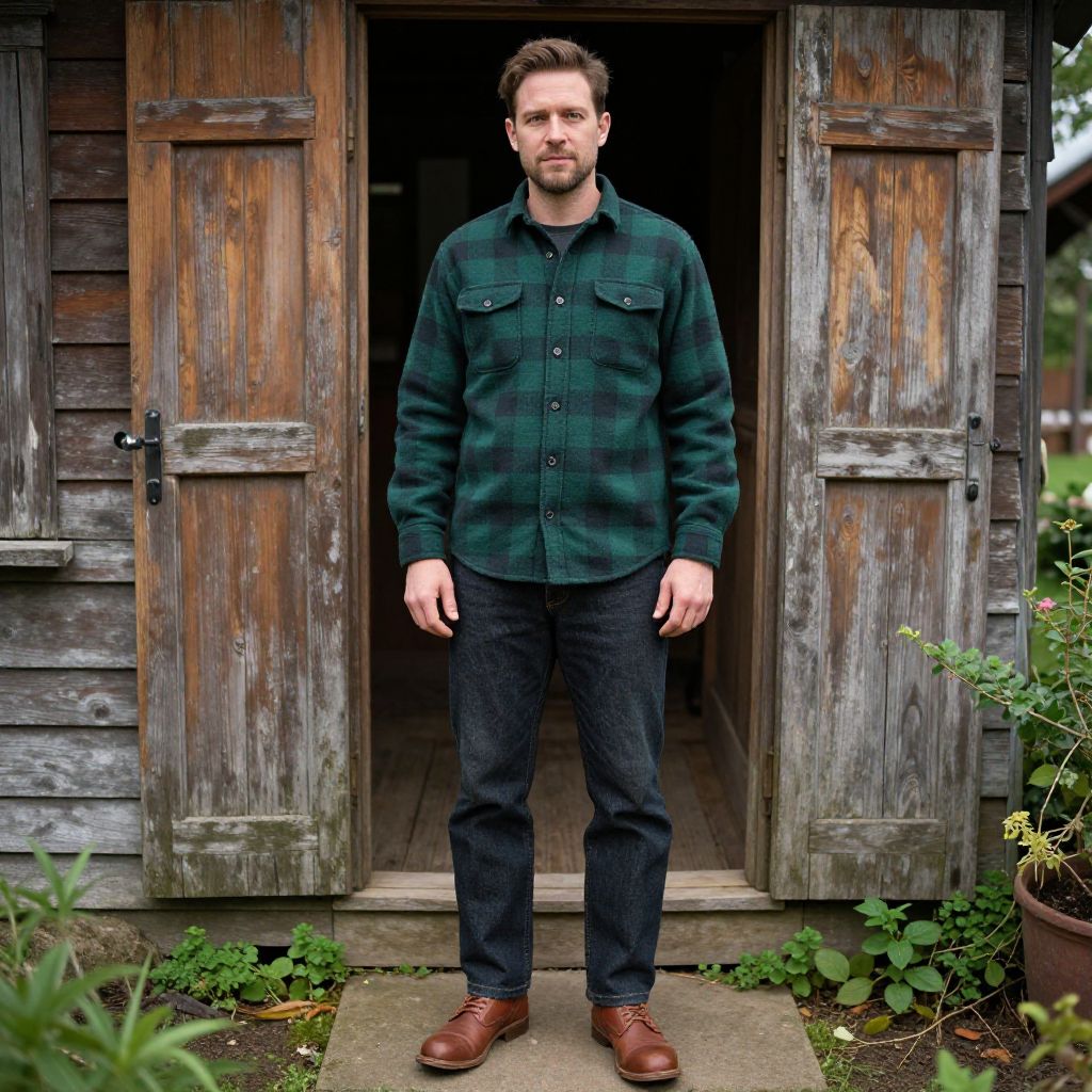 Photograph of a Caucasian man with short brown hair and a trimmed beard, standing in front of a rustic, weathered wooden shed. He wears a dark green plaid shirt with buttoned chest pockets, black denim jeans, and brown leather shoes. The shed's wooden doors are open, revealing a dark interior. The wooden texture is rough and aged, with green plants and flowers visible on the left and right edges of the image. The man stands on a concrete step, looking directly at the camera with a neutral expression. The overall setting is outdoors, with natural light.