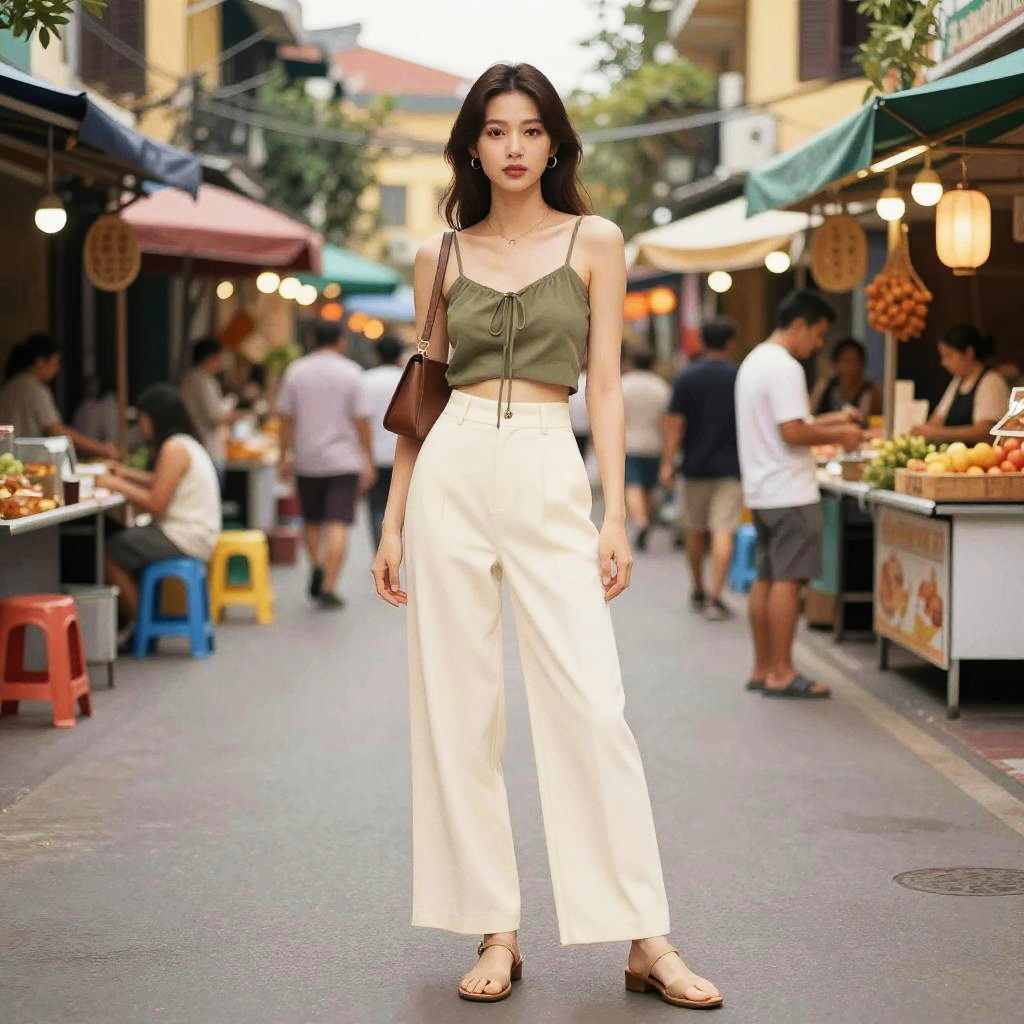 A woman in a casual chic outfit featuring an olive green cropped spaghetti strap top with a front tie and cream high-waisted wide-leg trousers, accessorized with open-toe flat sandals and a shoulder bag. She stands in a vibrant Street Food Experience in Hanoi Old Quarter, surrounded by colorful stalls and bustling activity, illustrated in the style of nbm graphic novels. Sexy. Pretty face and beutiful eyes