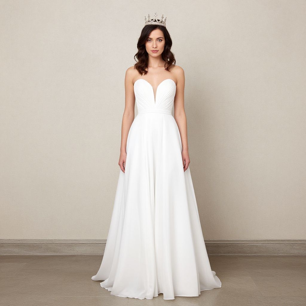 Photograph of a young woman standing against a plain, light beige wall. She has fair skin and dark, wavy hair that falls to her shoulders. She wears a white, strapless, V-neck wedding gown with a fitted bodice and a flowing, floor-length skirt. A silver tiara with small jewels rests on her head. The gown is made of a smooth, satin-like fabric that reflects light. She stands with her arms relaxed at her sides, and her expression is neutral. The floor is wooden, adding a subtle texture to the image.