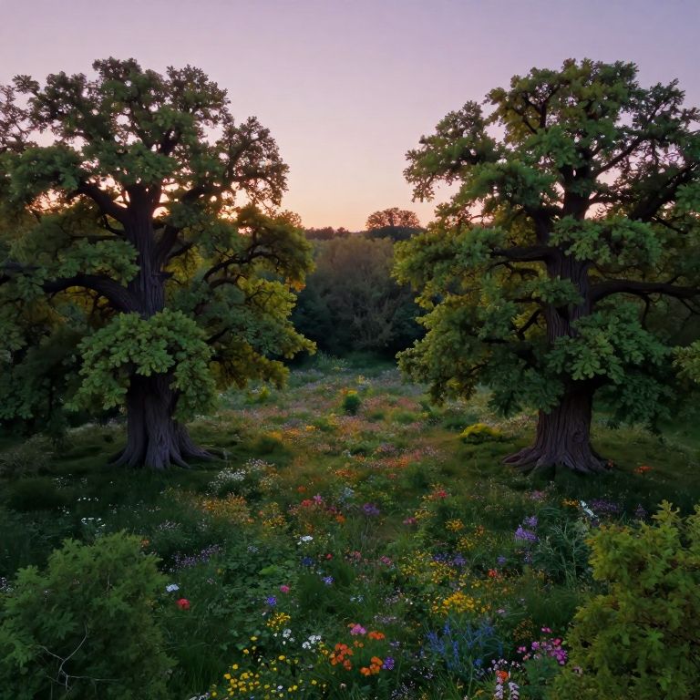 Visualize an aerial perspective reminiscent of a renowned landscape series, showcasing a tranquil scene with a grand tree positioned at its heart. The tree's limbs extend like delicate brushstrokes, casting intricate shadows over the calm pond beneath it. As twilight approaches, the sky transforms from gentle pastel hues to rich, deep shades of blue, creating an emotional spectrum that embodies both tranquility and solitude within this idyllic retreat. This hyperrealistic oil painting encapsulates the ethereal charm of nature's splendor, inviting viewers to immerse themselves in its captivating intricacies as if observed through a bug's-eye lens, fostering a profound appreciation for the intricate bond between humanity, the natural world, and artistic expression.