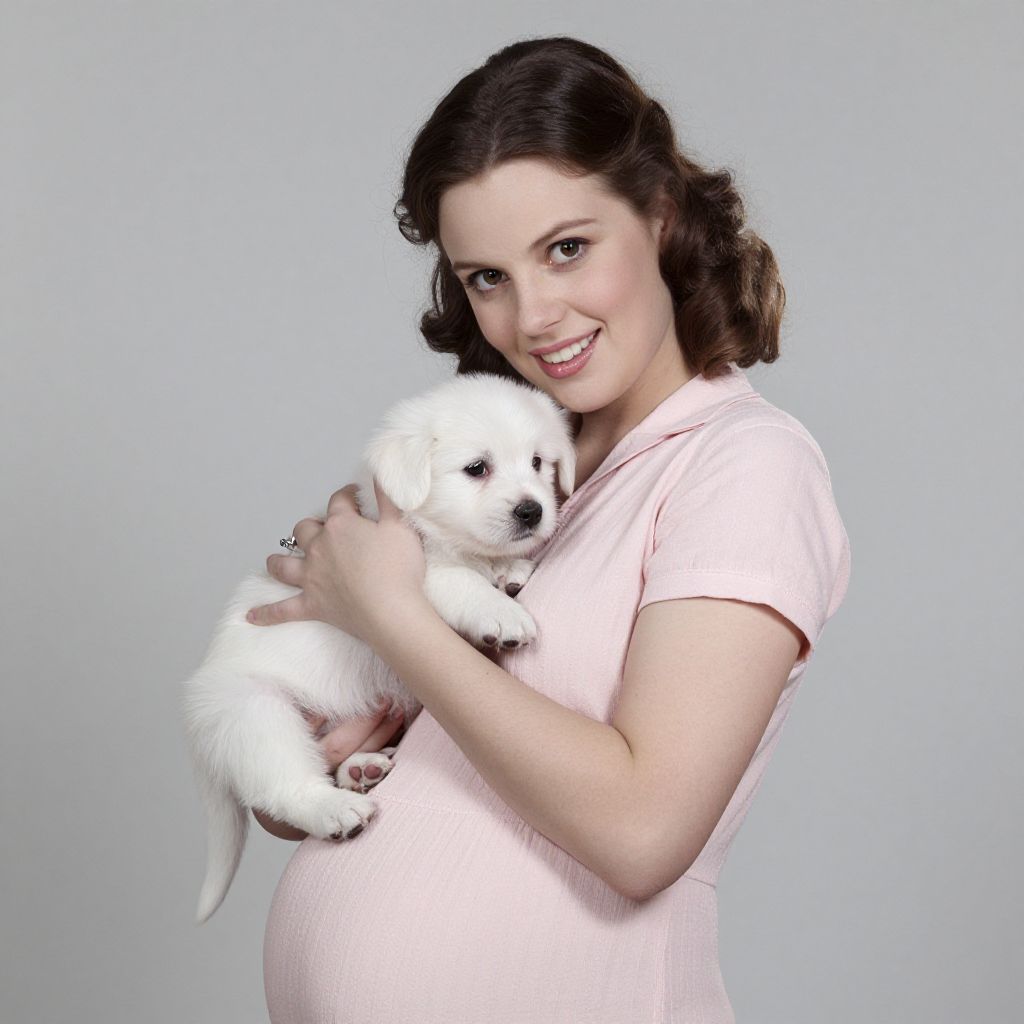 In this tender 1951 portrait, a serene blend of maternal joy and the innocence of new life is captured, as a pregnant woman cradles a fluffy white puppy, symbolizing the delicate balance between nurturing growth and the promise of boundless love.