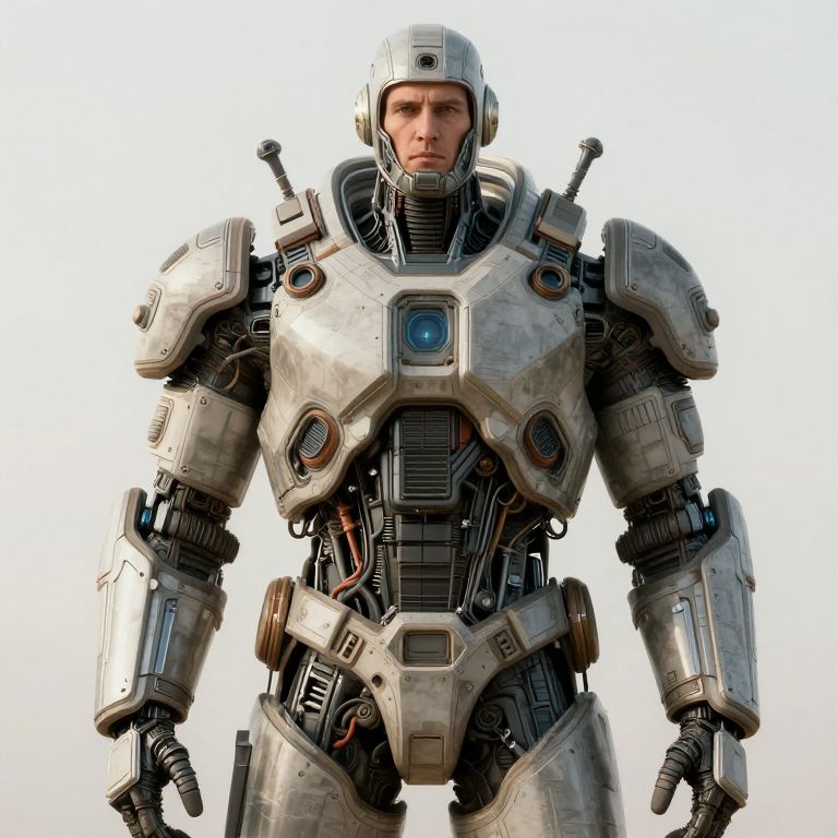 Photorealistic CGI image of a muscular man in a futuristic, silver metallic armor suit with a white helmet. The armor has intricate details, including blue circular lights, and exposed mechanical parts on the chest and arms. His expression is serious, and he stands against a plain white background. The armor has a mix of smooth and rugged textures, with various tubes and wires visible. The suit's design is reminiscent of a sci-fi or superhero character, emphasizing strength and advanced technology.