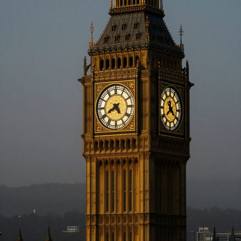 Imposing clock tower stands tall with twelve golden clock faces, each displaying distinct times, casting intricate shadows that ripple across the misty landscape beneath.