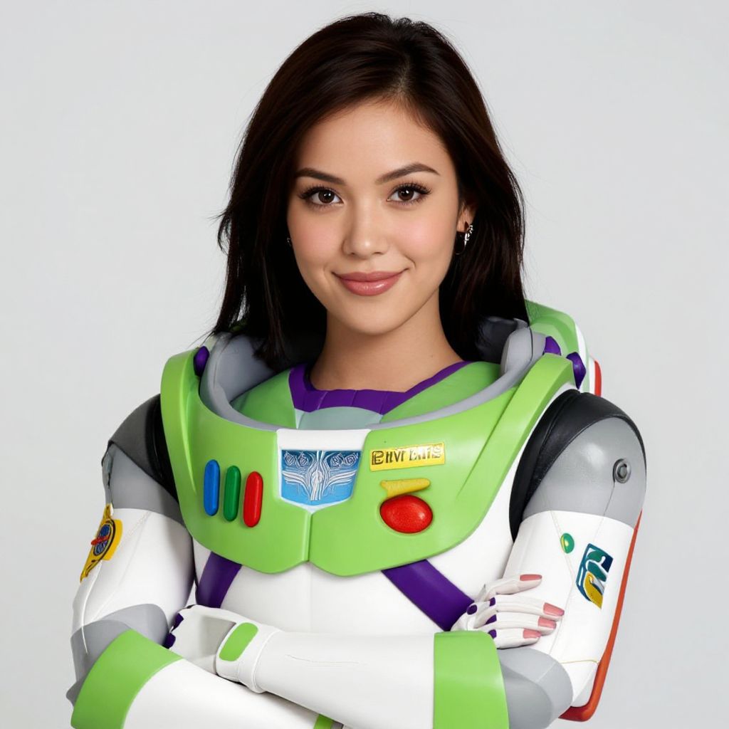 "female buzz lightyear, 1girl, solo, crossed arms, long hair, jewelry, brown eyes, earrings, gloves, realistic, black hair, brown hair, looking at viewer, smile, lips Realistic photo of casual sexy person with pretty face"