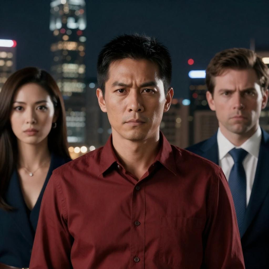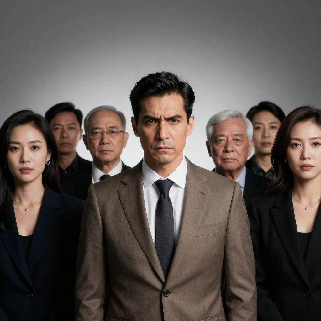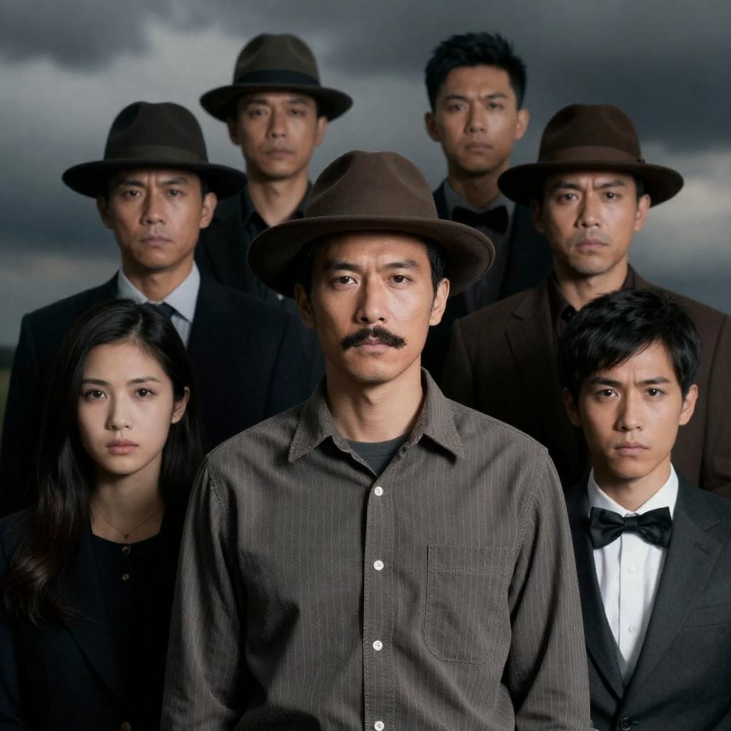 Six Asian adults posed in a dramatic and intense scene outdoors under a dark sky. The group includes five men dressed in dark suits and ties, with one man pointing a handgun toward the camera. A woman wearing a sleeveless red dress stands prominently in front with long wavy hair and bold makeup. The background features moody clouds, hills, and a red flag positioned behind the tallest man in the center. The overall atmosphere is serious and cinematic, emphasizing tension and focus.
