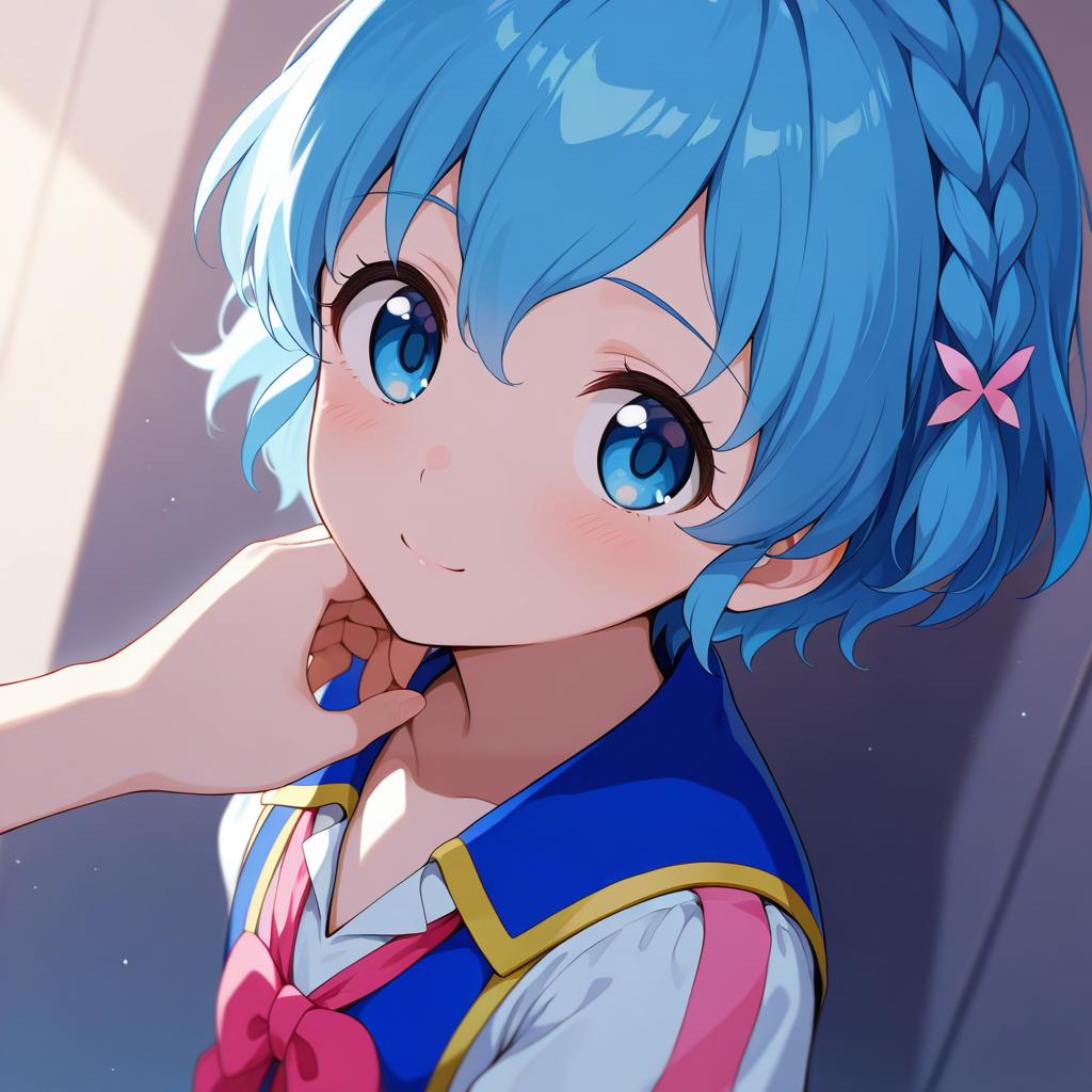 Close-up of an anime-style girl with blue eyes and short blue hair featuring a side braid adorned with a pink flower. She wears a blue and white outfit with a pink bow and yellow trim, depicted in a bright, soft light setting with a gentle smile.