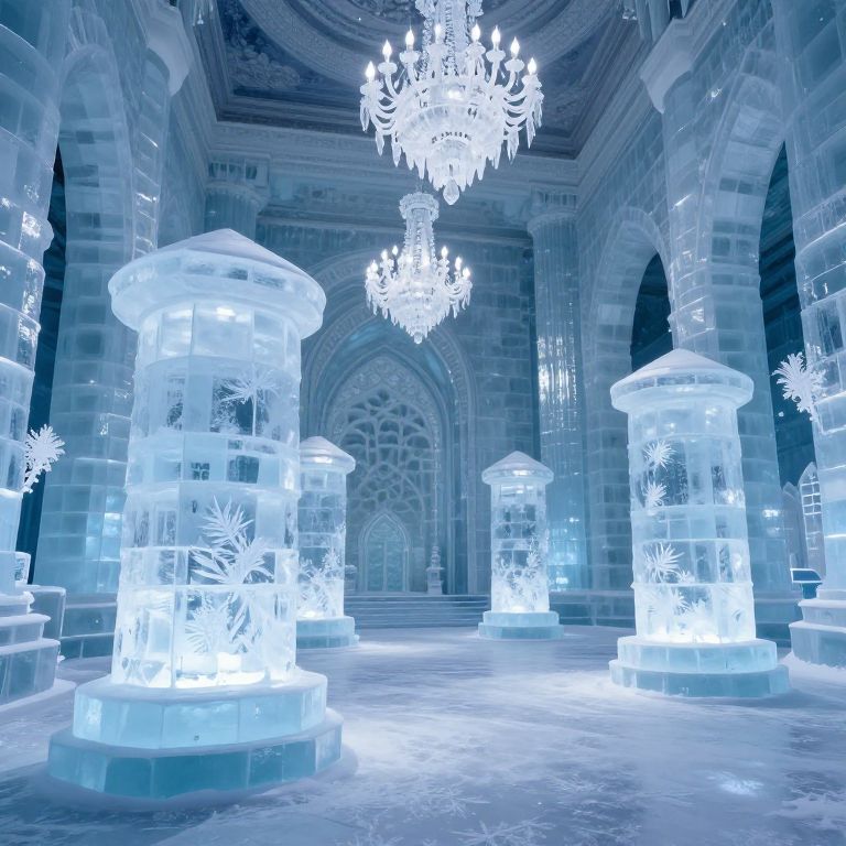 Photograph of a grand, icy interior featuring three glowing, crystalline ice structures with intricate, illuminated designs. The background showcases an ornate, arched stone wall with detailed carvings. Two opulent chandeliers, also made of ice, hang from the ceiling, casting a bright, ethereal light. The floor is covered with a thin layer of ice, enhancing the overall frozen aesthetic. The entire scene is bathed in a cool blue light, creating a magical, wintry ambiance. The textures range from the smooth, translucent ice to the rough, stone arches.