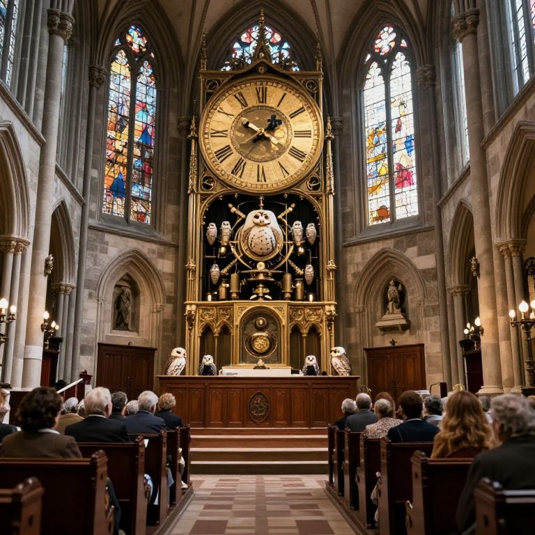 In the solemn embrace of a clockwork cathedral, a parliament of owls convenes in a chamber of timeless wisdom, their rhythmic hoots and mechanical chimes echoing the eternal dance between vigilance and mystery.