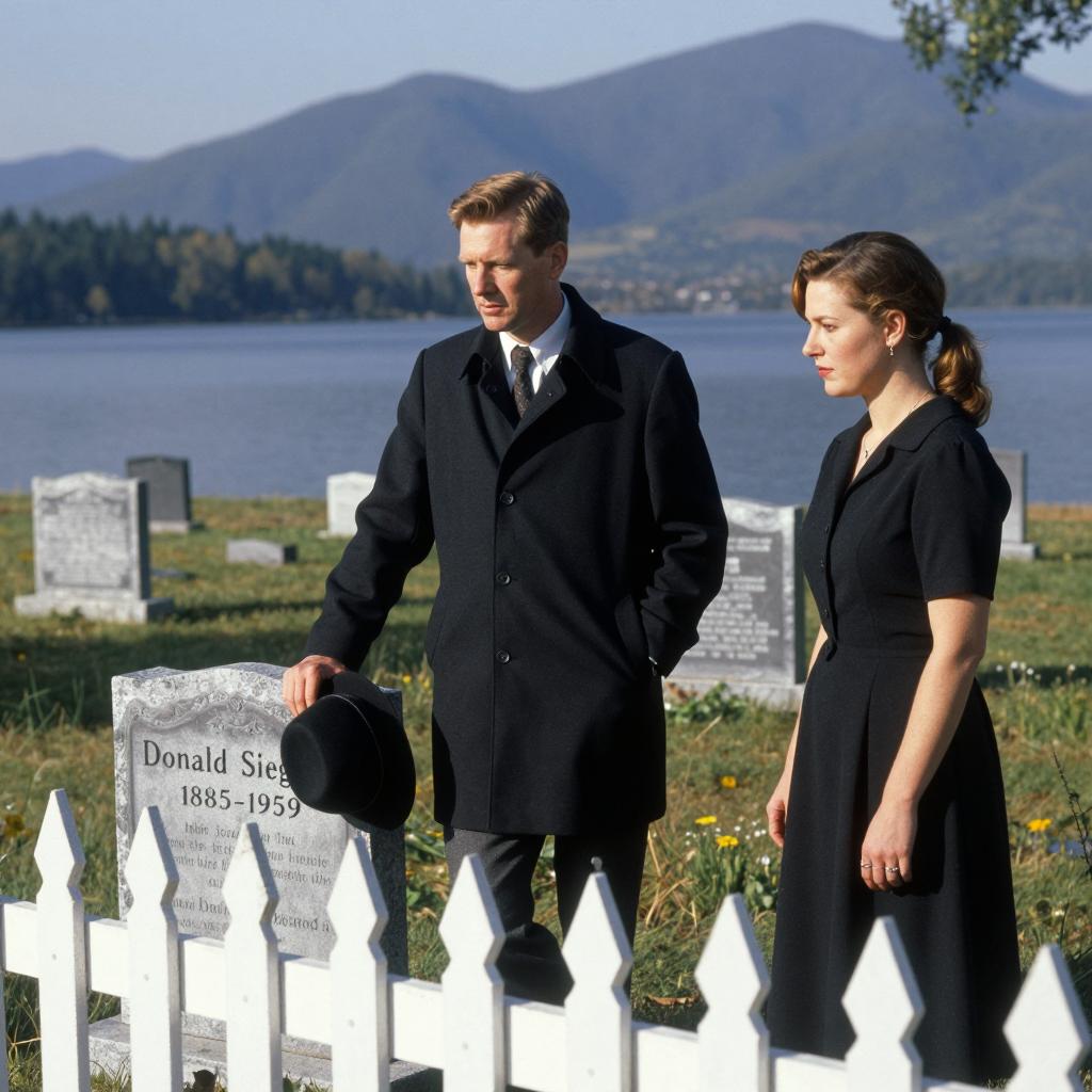 Photograph of two people standing in a grassy cemetery by a lake. Man in black coat, holding hat, leaning on gravestone. Woman in black dress, ponytail, standing beside him. Gravestone reads "Donald Siegel, 1885-1959." White picket fence in foreground. Lake and mountains in background. Daytime, sunny. Man's expression is neutral, woman's expression is contemplative. Two people, both standing.