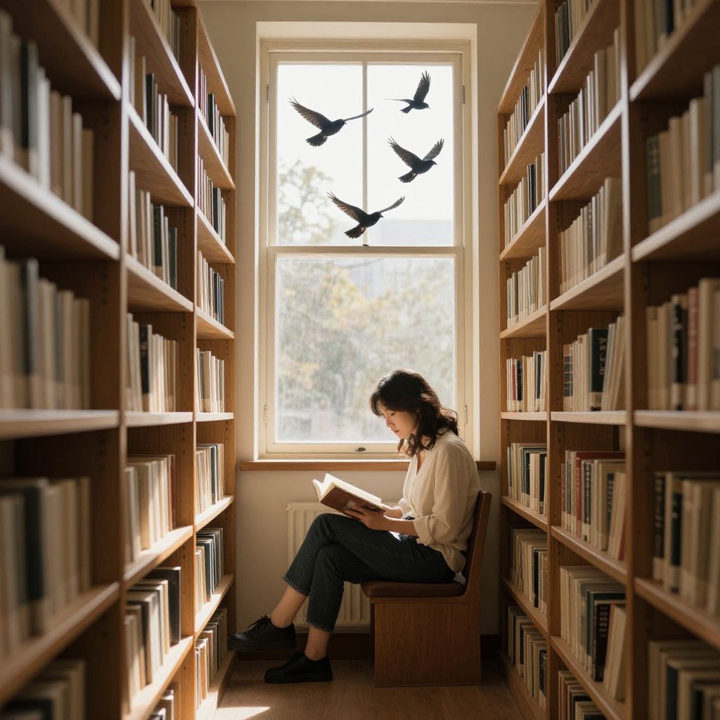 Photograph of a woman with curly hair reading in a sunlit library aisle, surrounded by tall wooden bookshelves, with black birds silhouet