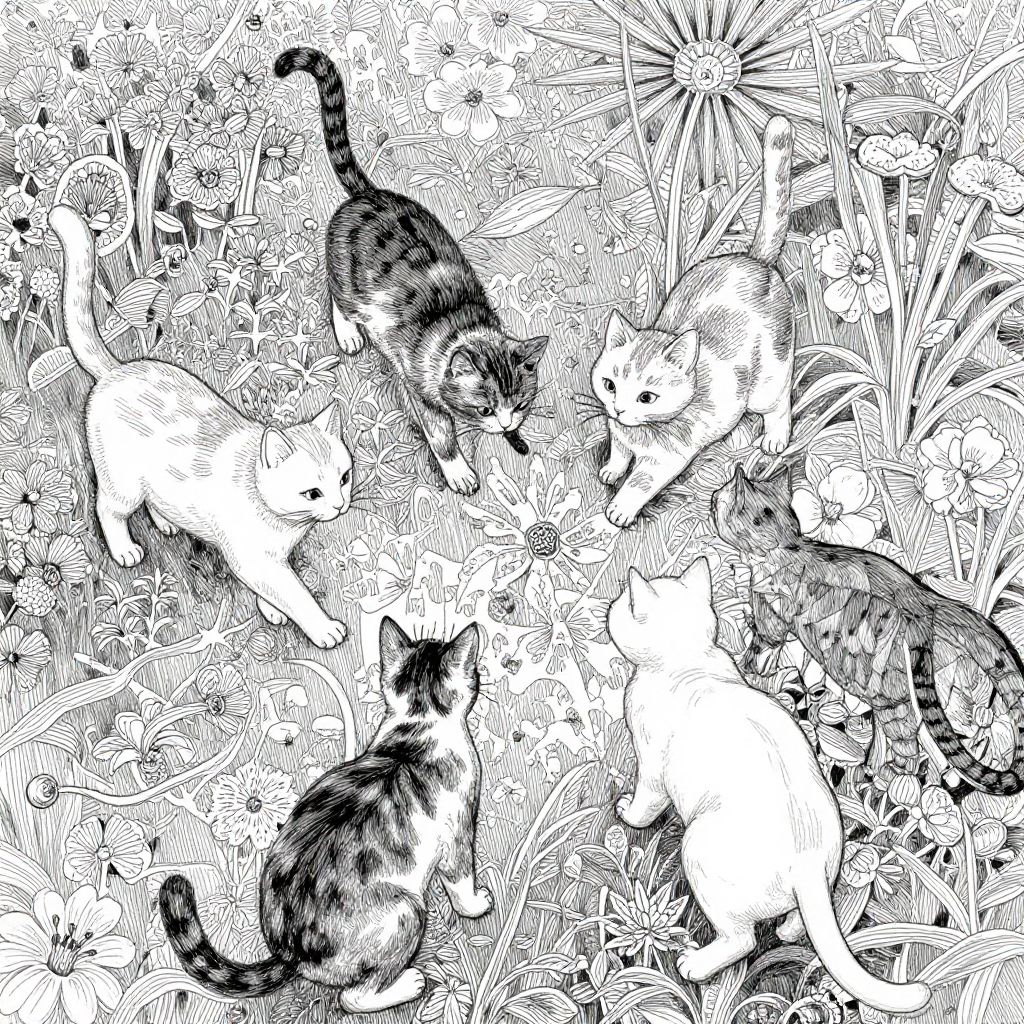 Intricate Ink Cats in Flower Garden