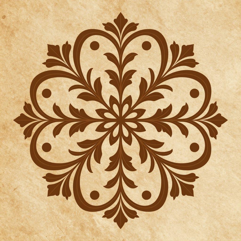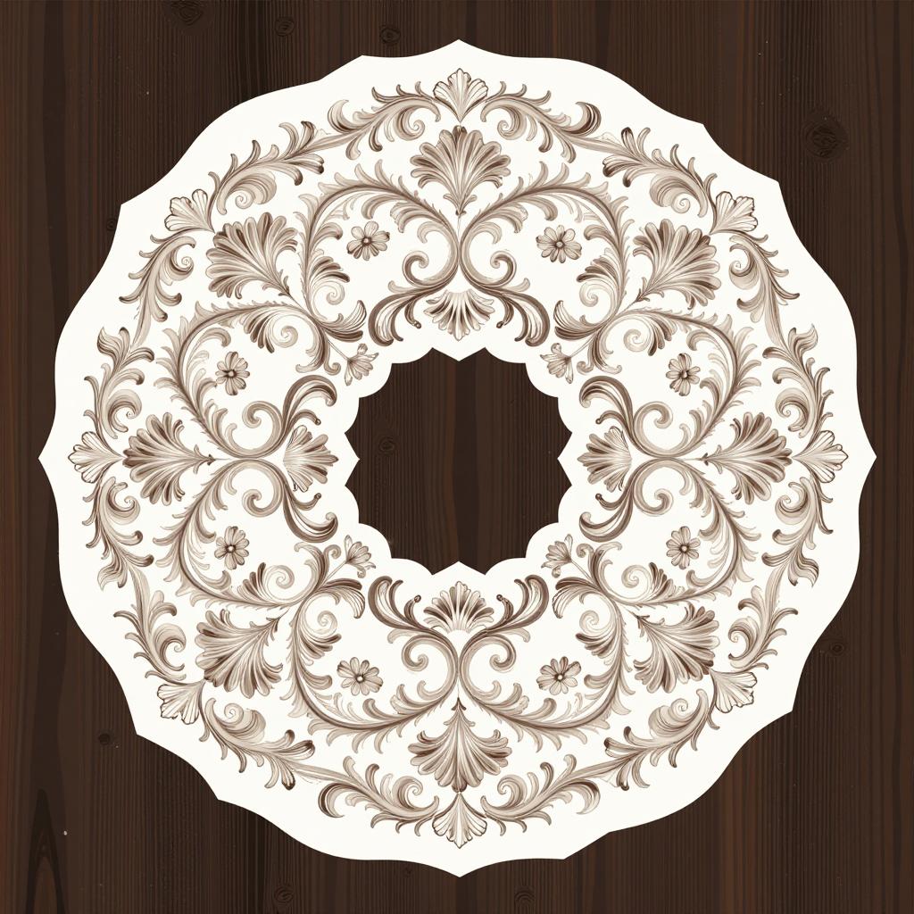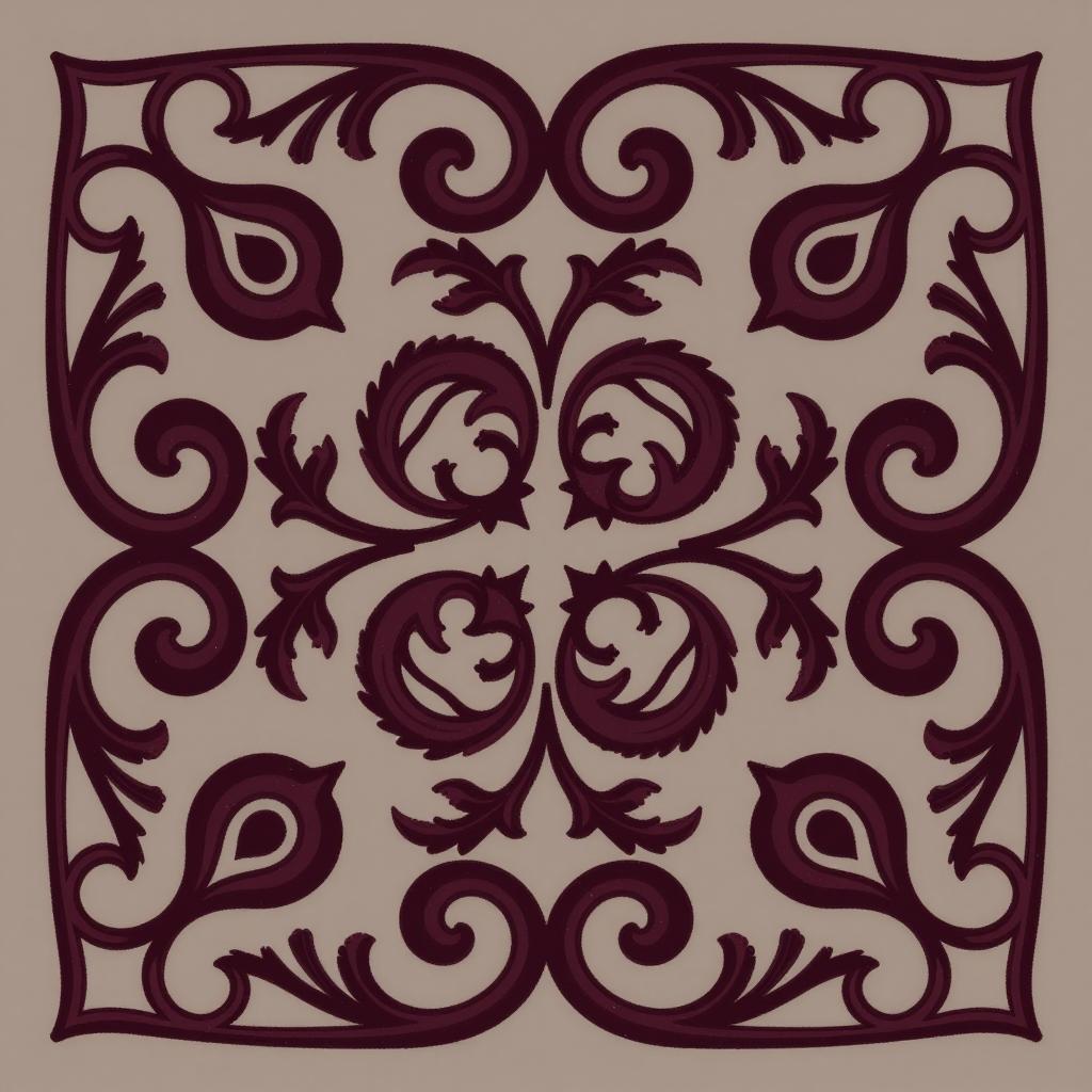 Scrollworks pattern featuring tattoo-style scrollwork with bold outlines and negative space in deep burgundy scrollwork on muted taupe arranged as radiating scrolls from the center forming a mandala-like design on glass panel with frosted scroll etching rendered as laser-etched effect with glowing edges, ultra-detailed, sharp ornamental design, high resolution, intricate decorative pattern art