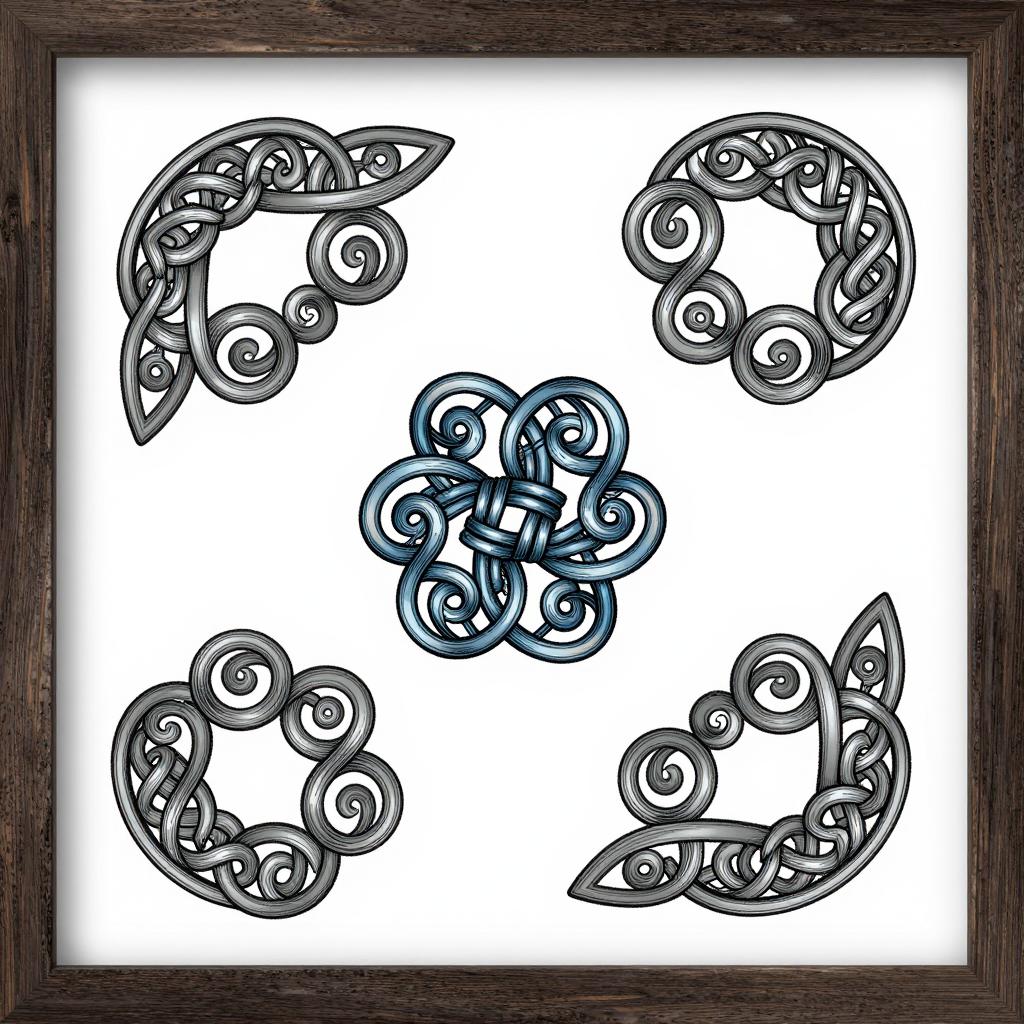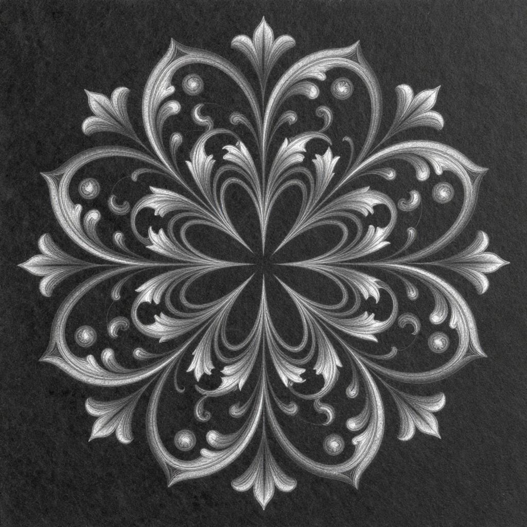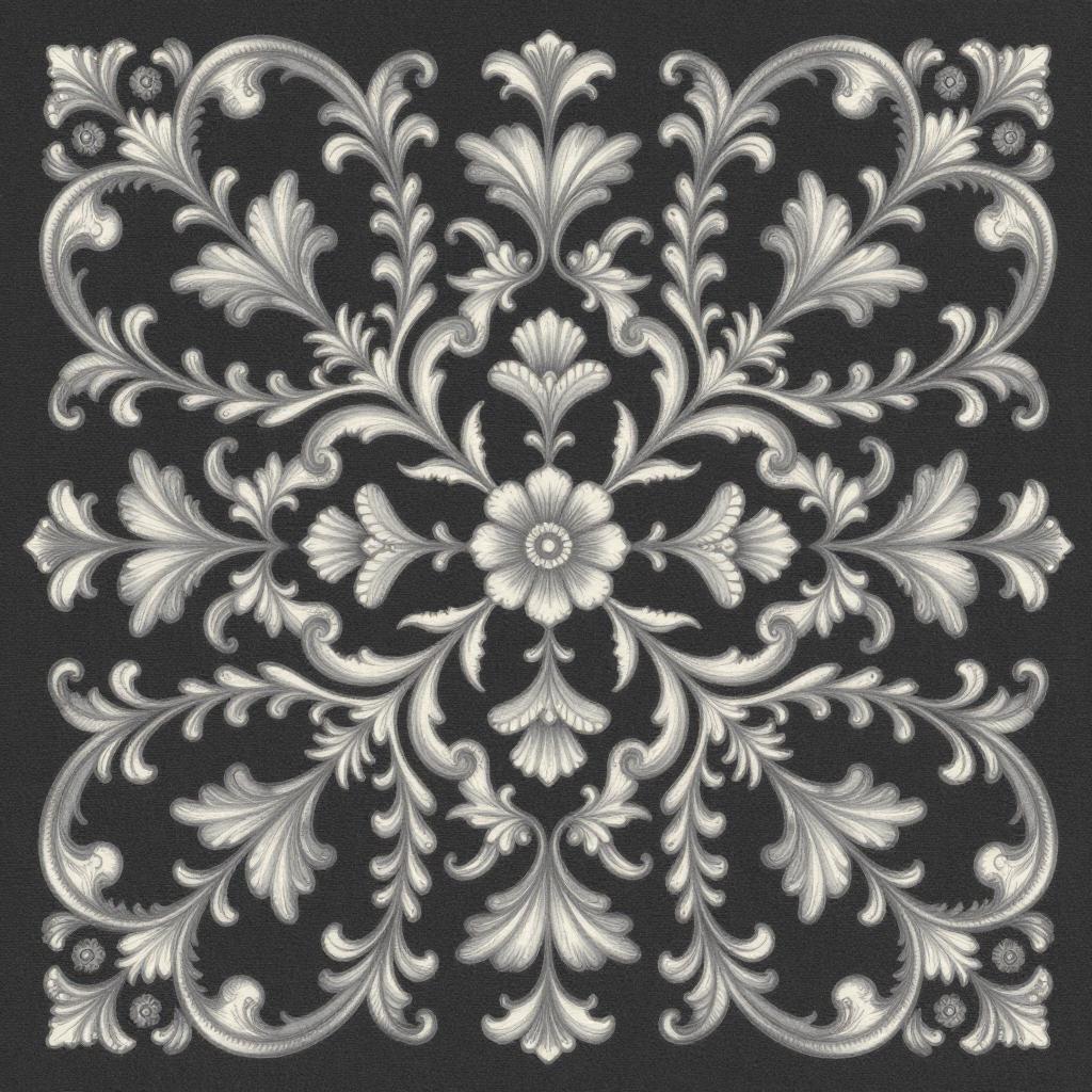 Scrollworks pattern featuring tattoo-style scrollwork with bold outlines and negative space in deep burgundy scrollwork on muted taupe arranged as radiating scrolls from the center forming a mandala-like design on glass panel with frosted scroll etching rendered as laser-etched effect with glowing edges, ultra-detailed, sharp ornamental design, high resolution, intricate decorative pattern art