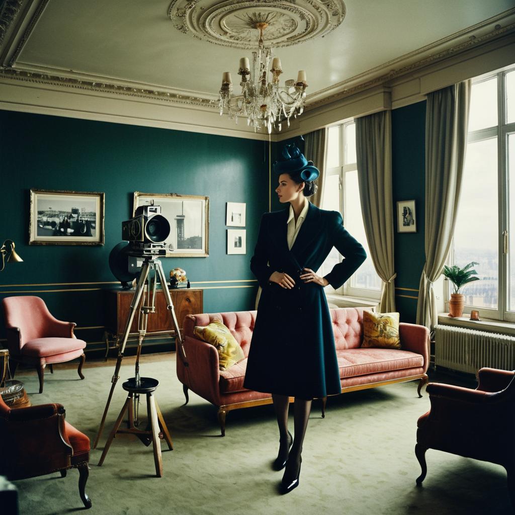 Glamour photography of a high fashion actress, captured in a historic luxury mansion, styled in the Tim Walker's whimsical vividness. The image highlights high fashion and striking professional photography.
