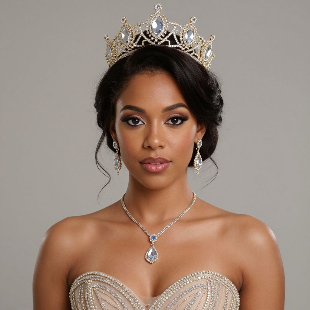 Photograph of a beautiful, dark-skinned woman with an elegant updo, wearing a sparkling gold crown, diamond necklace, and strapless beaded
