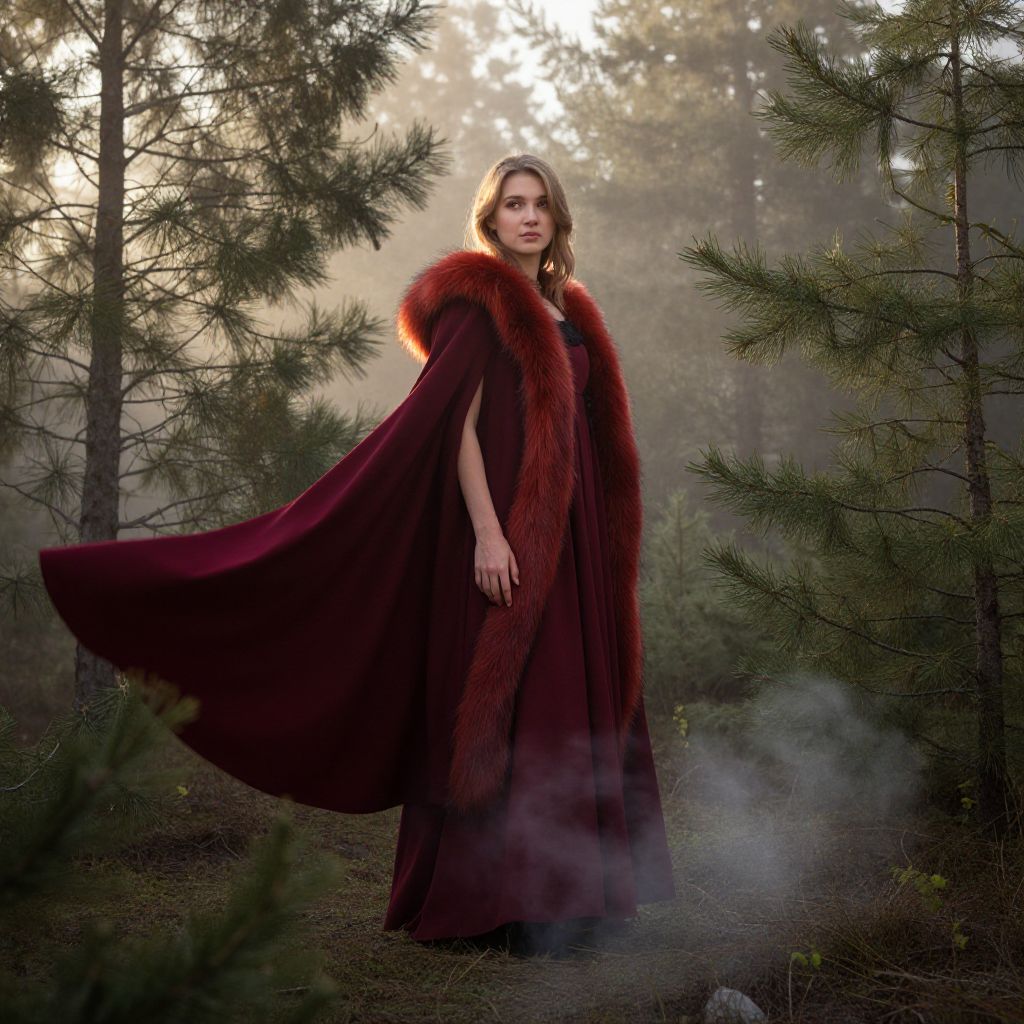 Photograph of a woman in a deep red, fur-trimmed cape standing in a misty forest, sunlight filtering through trees.