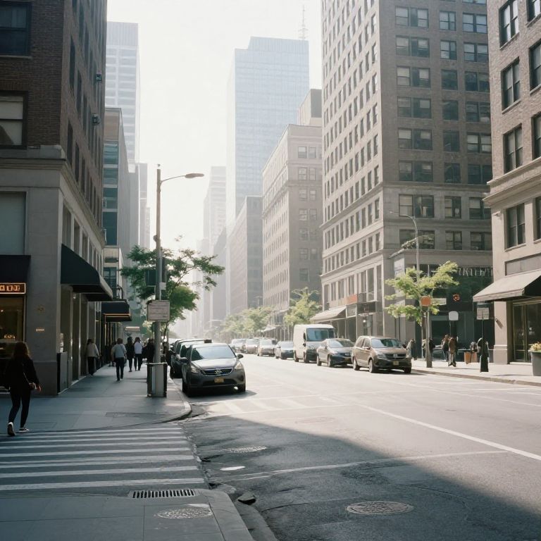Photograph of a sunlit urban street in a city, lined with tall, beige and brown brick buildings. Cars, including a white van, are parked along the right side and driving down the street. Pedestrians, some in dark clothing, walk on the left sidewalk. A crosswalk is visible in the foreground, with a "STOP" sign in the lower left. Trees and streetlights are interspersed along the sidewalks. The sky is bright, creating a high-contrast effect with the shadows of the buildings. The overall scene is bustling yet orderly, capturing a typical city atmosphere.