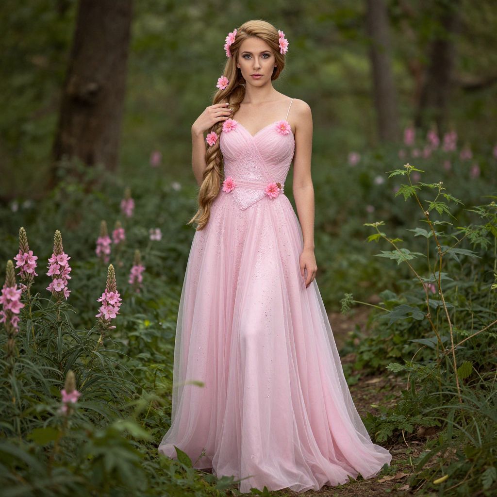 A beautiful woman with Rapunzel hair, wearing a long pink dress adorned with glitter dust and pink flowers, stands in a forest filled with greenery and more pink flowers.