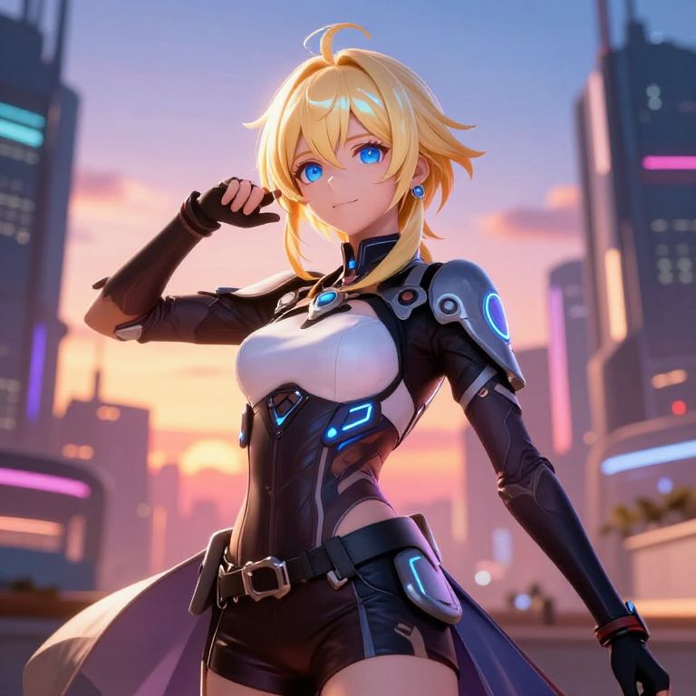 Digital art of a blonde, blue-eyed, anime-style female warrior in white and black armor, firing a glowing gun, in a futuristic stadium.
