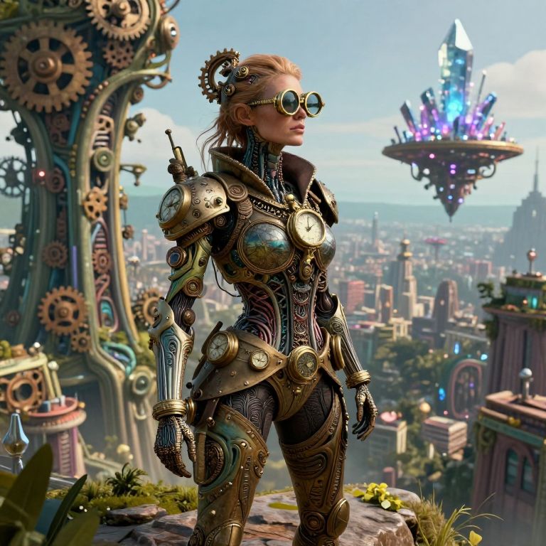 An artistic steampunk portrait depicting a female adventurer adorned with intricate, mechanical patterns resembling organic growths, reminiscent of H.R. Giger's imaginative designs. She stands on the precipice of an expansive, vibrant cityscape where towering structures meld seamlessly with nature, their facades adorned with gears and cogs as if they were constructed from interlocking machinery. The female explorer's attire is meticulously detailed, featuring brass spectacles and clockwork embellishments that harmoniously blend organic and mechanical elements both in her appearance and the surrounding environment. From a vantage point slightly elevated behind her, capture the fusion of technology and nature within this awe-inspiring cityscape, where a hovering, energy-crystal powered platform adds to the sense of wonder and innovation.