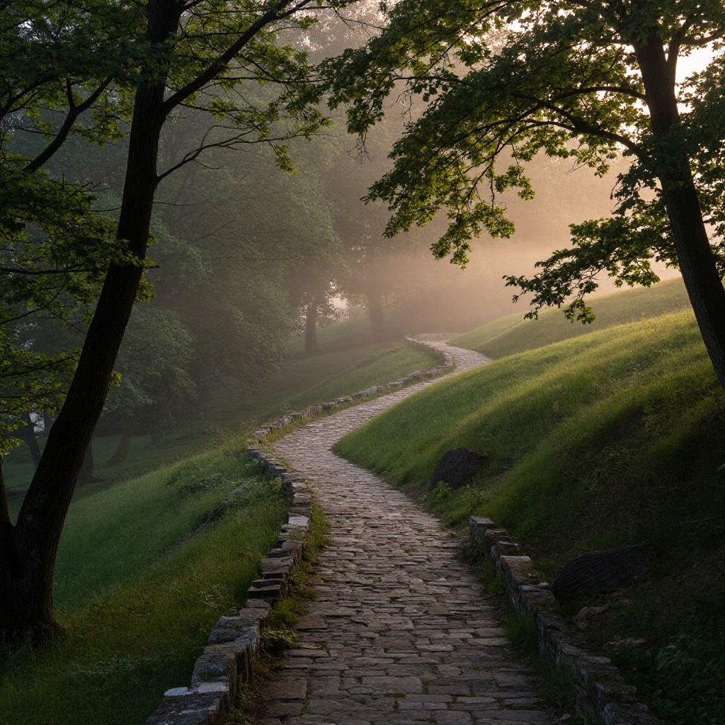 Photograph of a misty, sunlit stone path winding through lush green hills, bordered by tall trees, with soft morning light filtering through the leaves