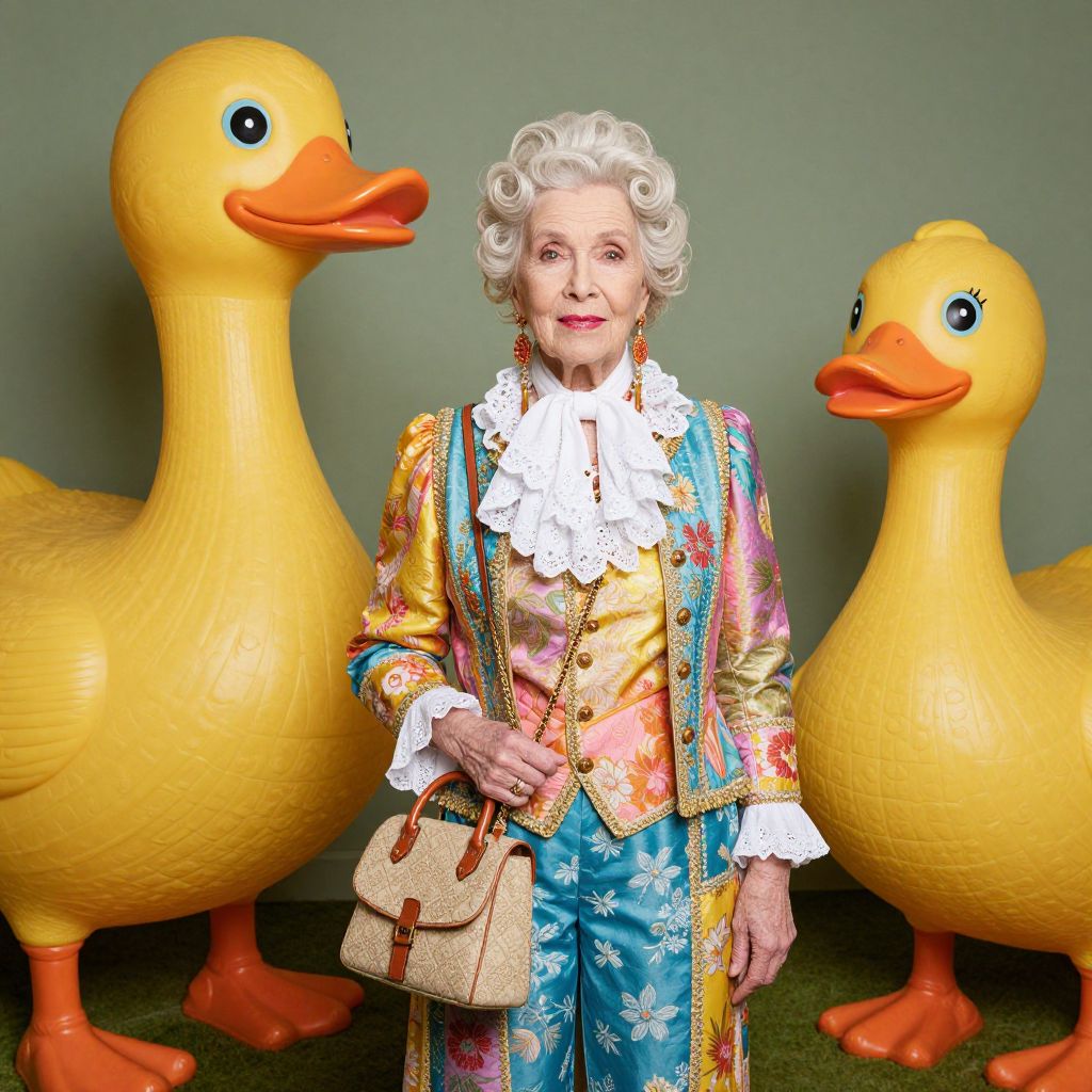 An elderly woman in a colorful outfit, surrounded by giant plastic ducks, exudes a quirky, fashion-forward style reminiscent of rococo art.