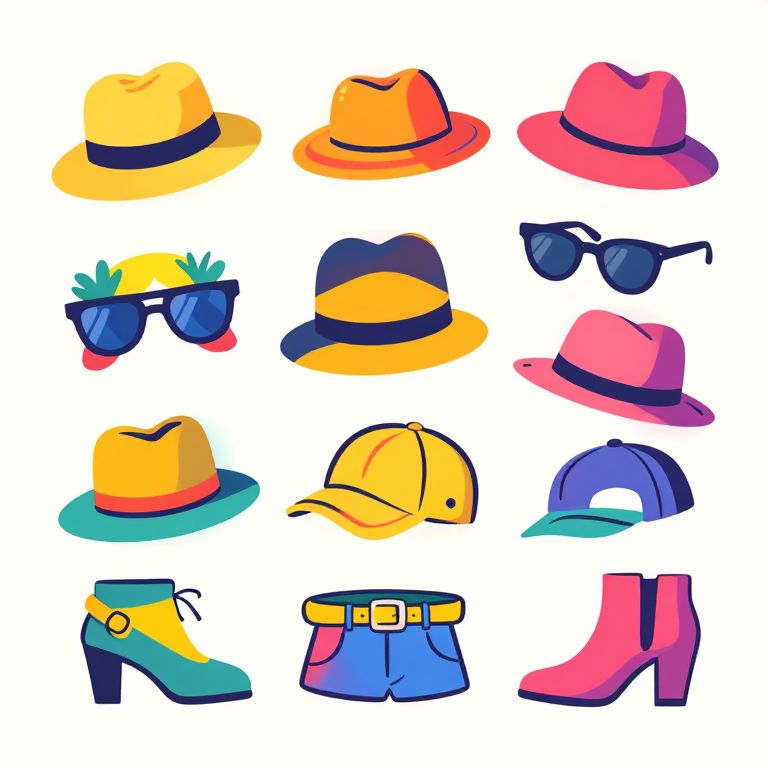 Style clip art featuring a vibrant collection of retro fashion icons, including stylized hats, sunglasses, and shoes, arranged in a playful, colorful pattern with bold outlines and a minimalist background