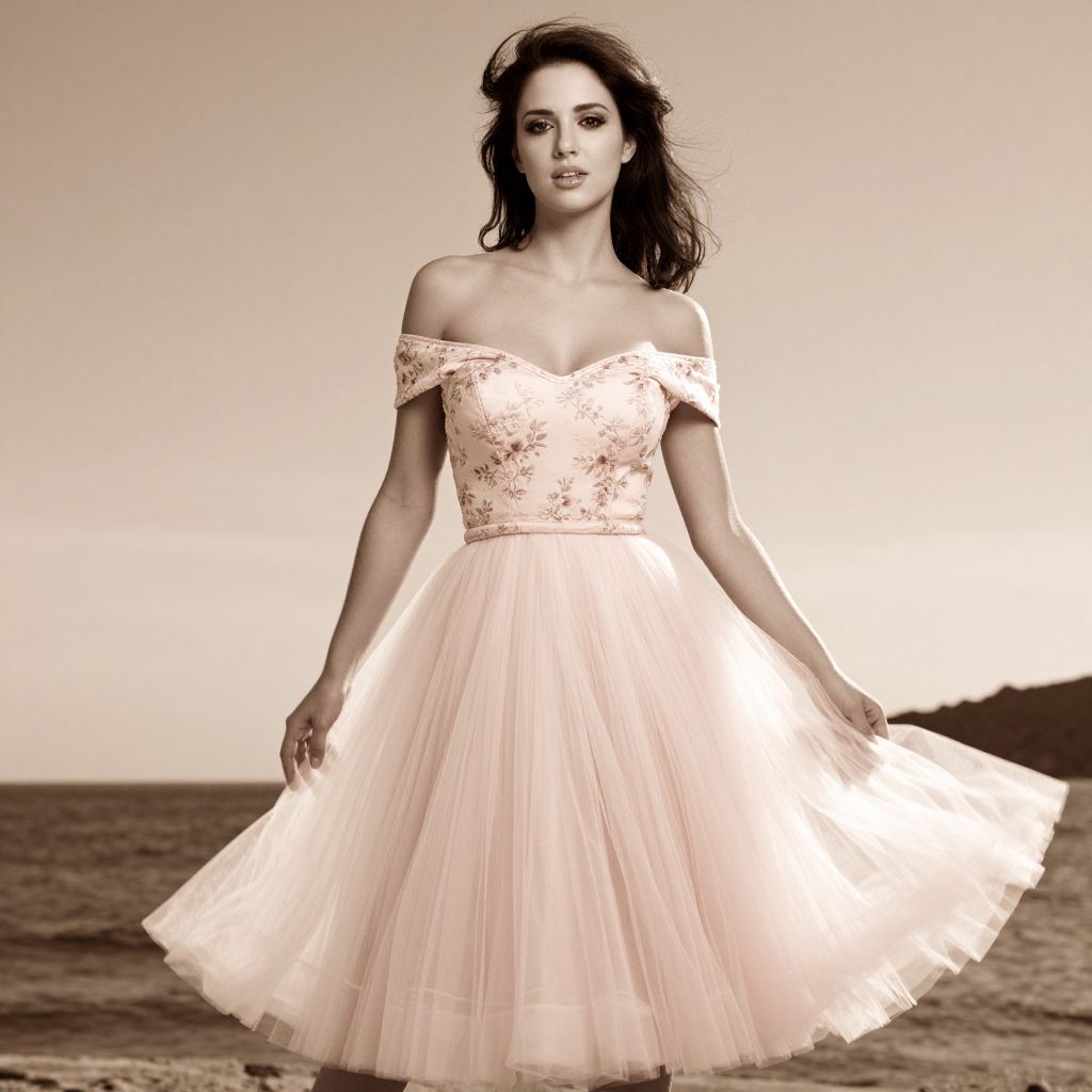 Photograph of a beautiful woman with dark hair, wearing an off-shoulder, floral-embellished, pale pink tulle dress, standing