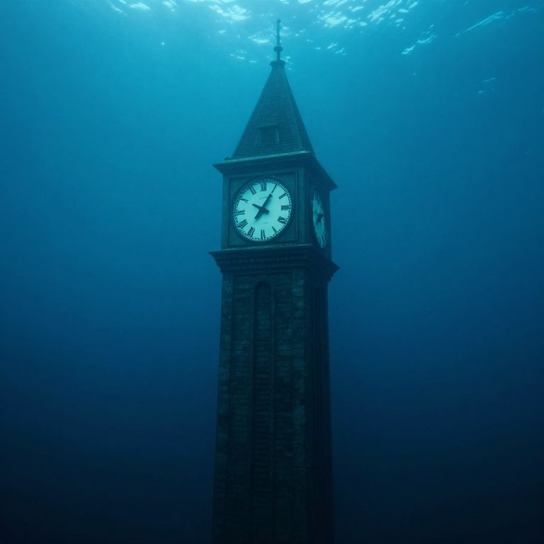 Submerged in the depths of the ocean, an inverted clock tower stands as a haunting symbol of transience, its reversed ticking echoing the relentless pull of gravity and the silent, eternal embrace of the sea.
