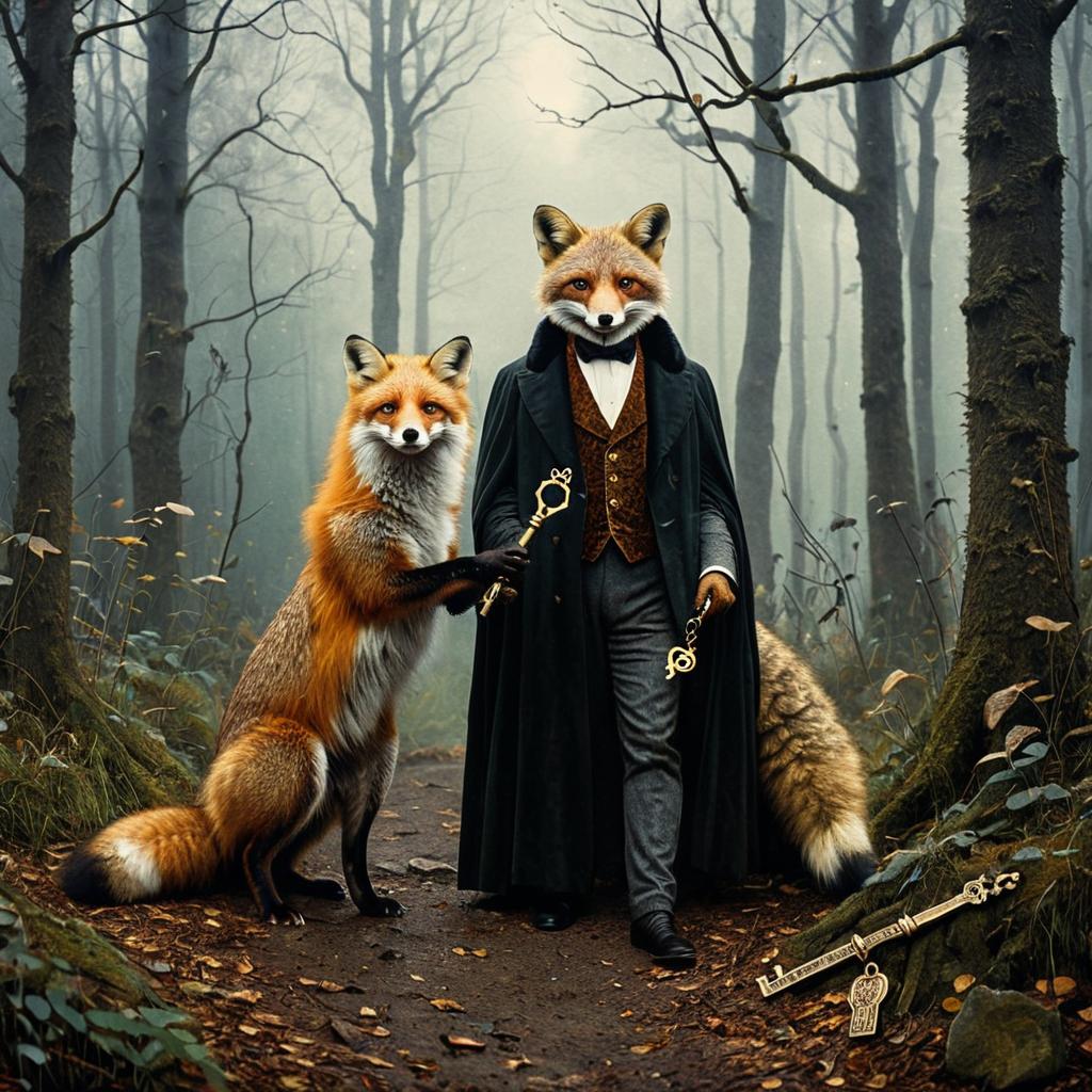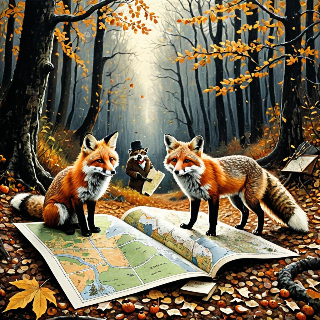 A detailed painting featuring two realistic foxes standing on an open map in a mysterious autumn forest. In the background, a mischievous raccoon dressed in a suit and top hat holds a map. The scene is set among tall, leafless trees with bright orange autumn leaves scattered on the ground and branches.