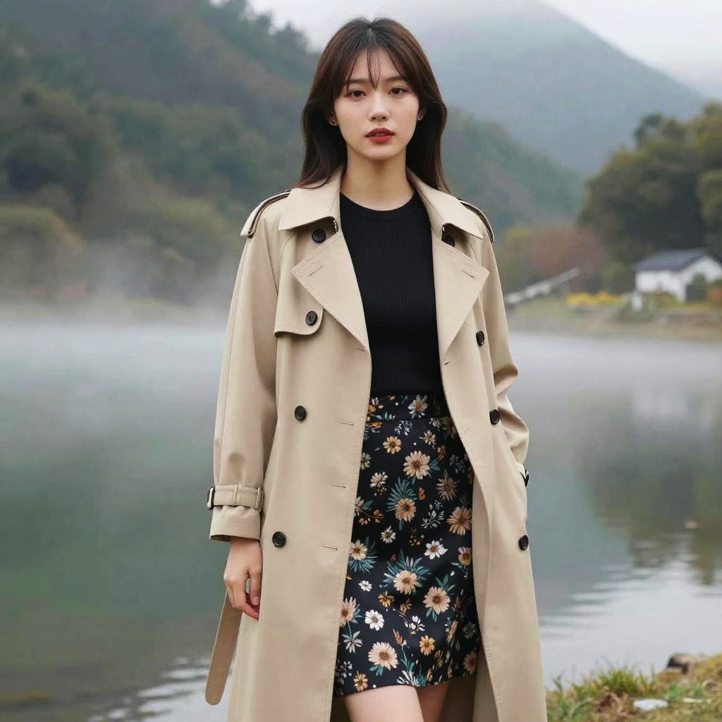 A stocky woman in a ufotable style, wearing an olive green anorak jacket, white crop top, and high-waisted black denim shorts, stands at a tranquil lakeside picnic spot, surrounded by nature, with black and white checkered slip-on sneakers and a wide-brimmed brown felt hat. Sexy. Pretty face and beutiful eyes