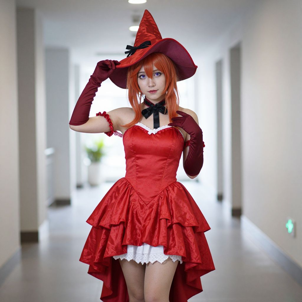 Red Witch Cosplay, woman in red dress and hat posing in a hallway