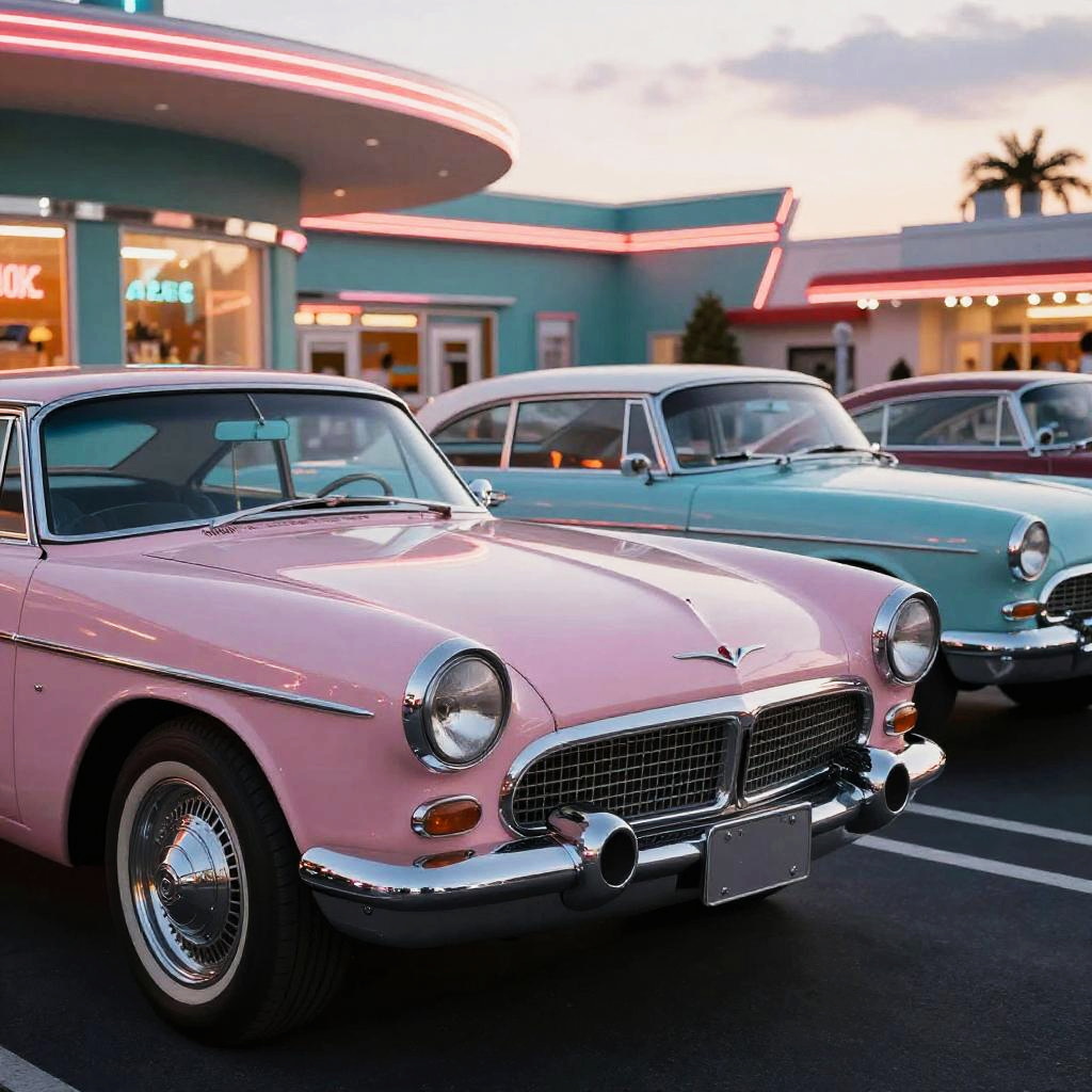 Futuristic retrofuturism cars parked in a vintage diner parking lot, chrome and pastel colors reflecting neon lights, blending classic 1960s design elements with advanced tech