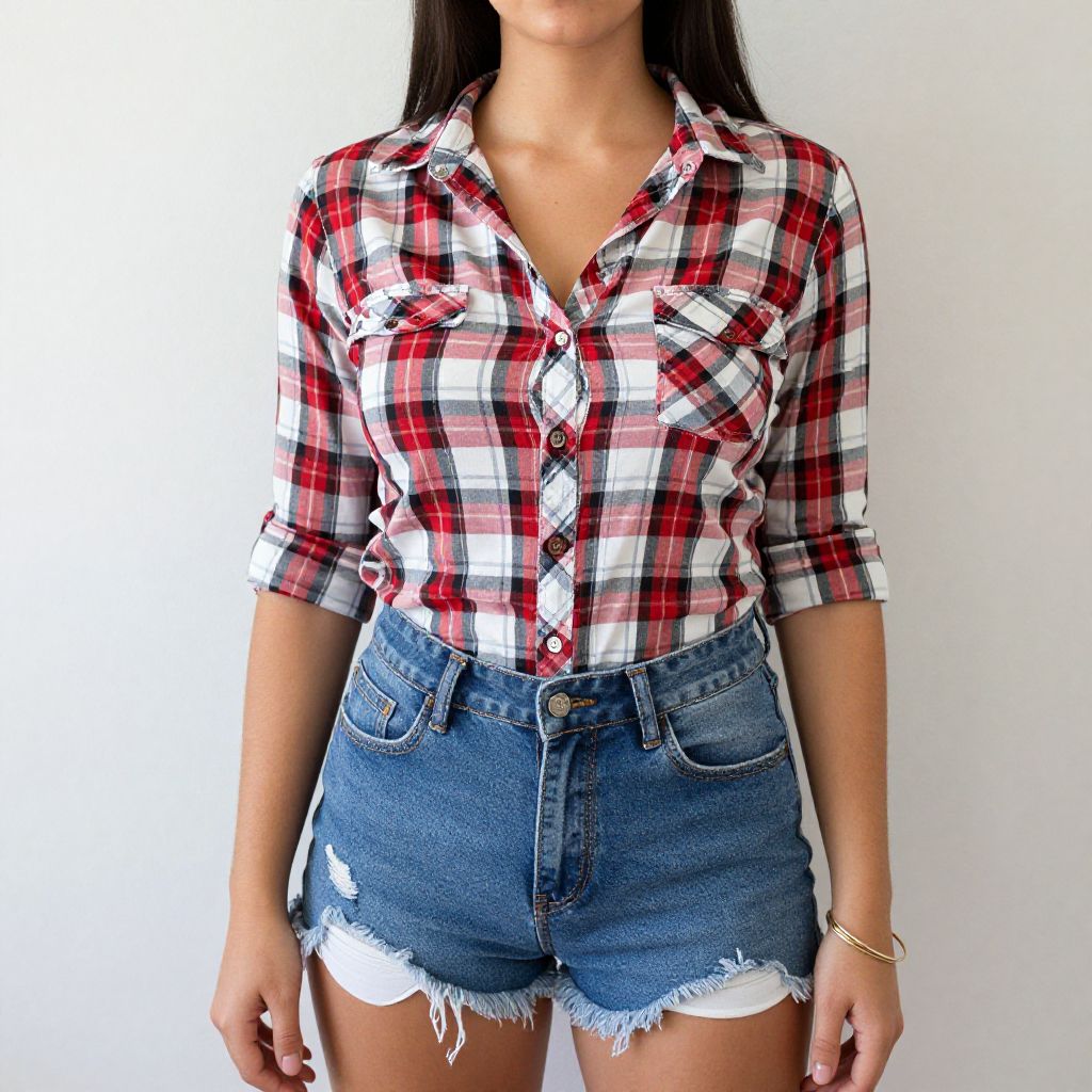 Photograph of a woman from the neck down, wearing a red, white, and black plaid button-up shirt with rolled sleeves and two chest pockets. She pairs it with high-waisted, blue denim shorts that have frayed edges and small rips. Her long, dark hair is straight and falls over her shoulders. She wears a gold bracelet on her left wrist. The background is a plain white wall, providing a clean, unobtrusive backdrop that highlights her outfit. The image is brightly lit, emphasizing the colors and textures of her clothing.